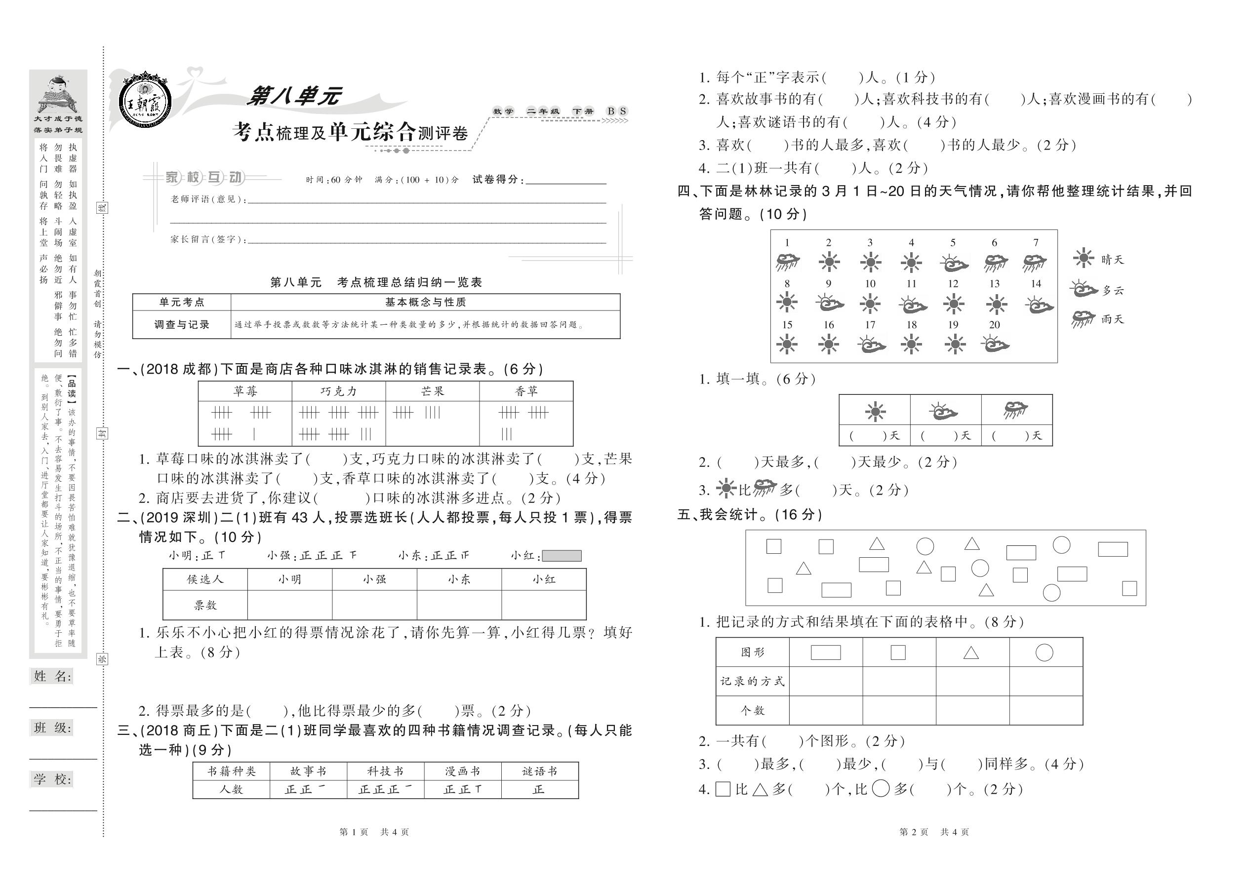 2021下册二年级数学北师版 第八单元 考点梳理及单元综合测评卷