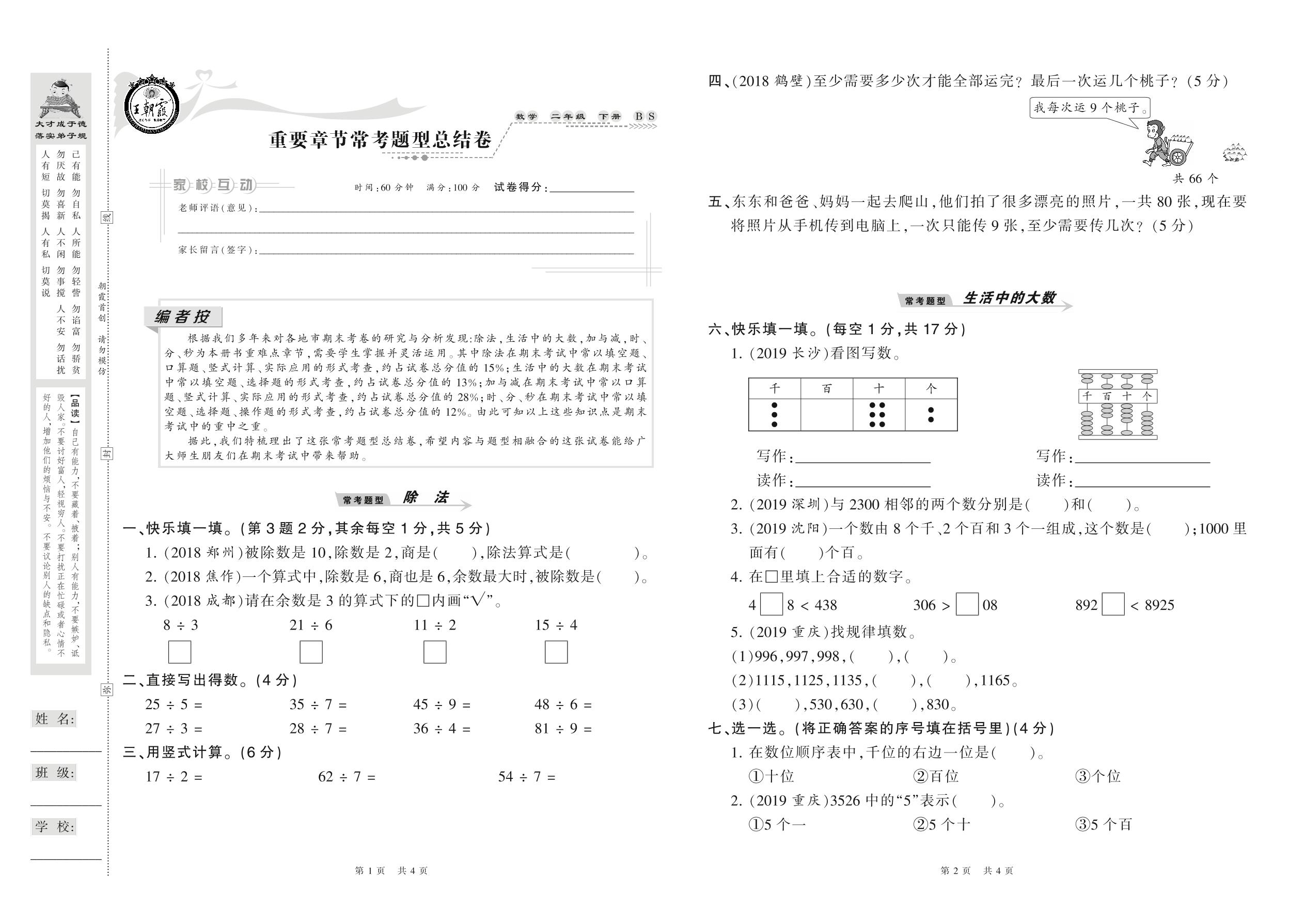 2021下册二年级数学北师版 重要章节常考题型总结卷
