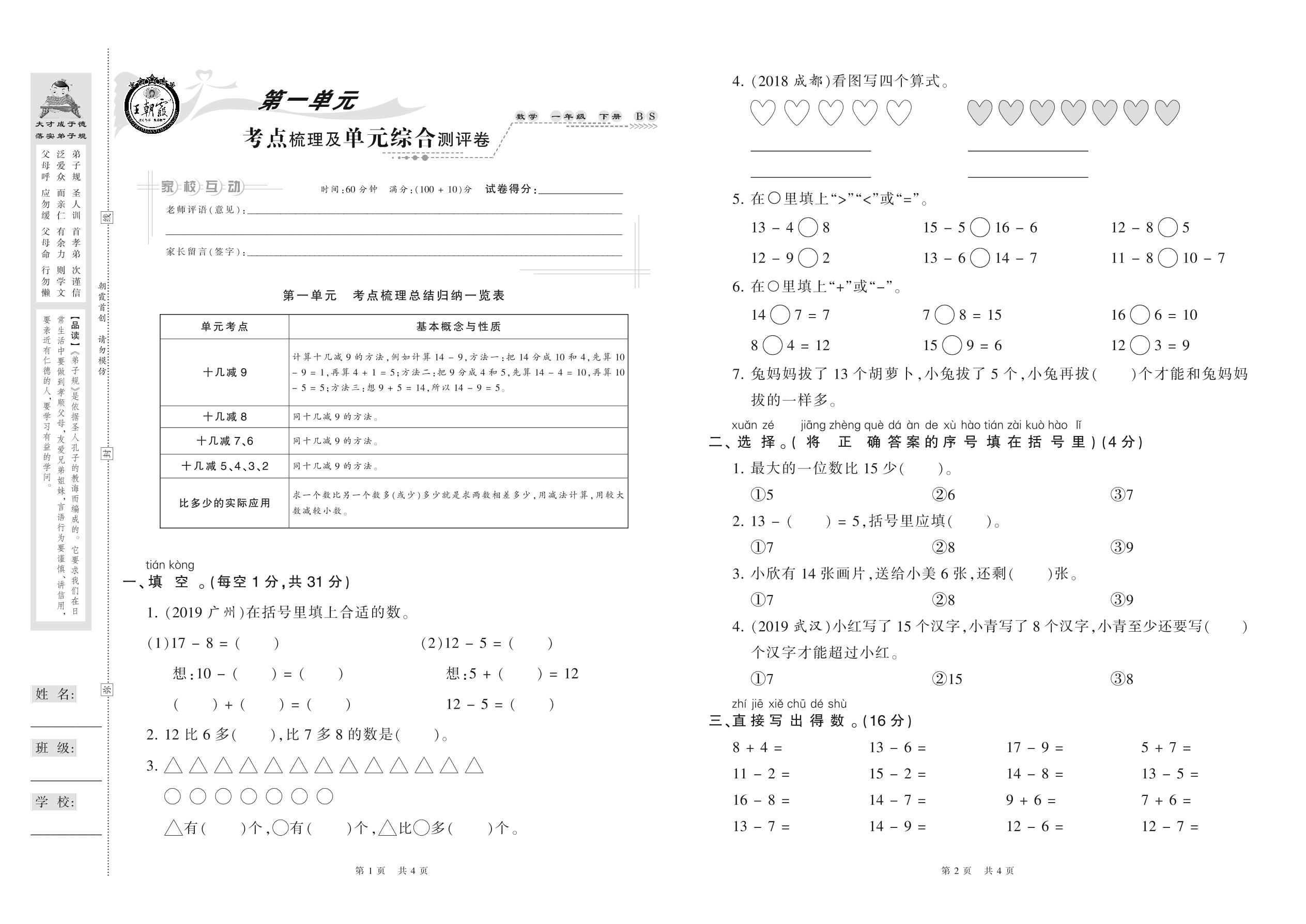 2021下册一年级数学北师版 第一单元 考点梳理及单元综合测评卷