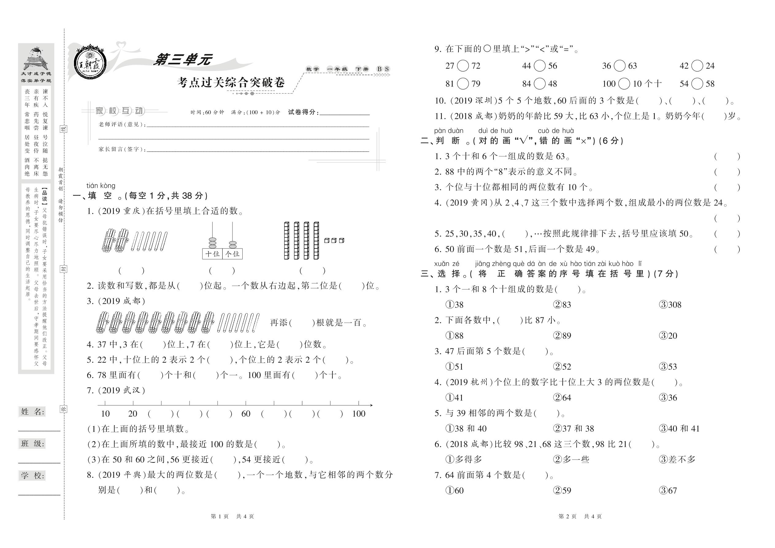 2021下册一年级数学北师版 第三单元 考点过关综合突破卷