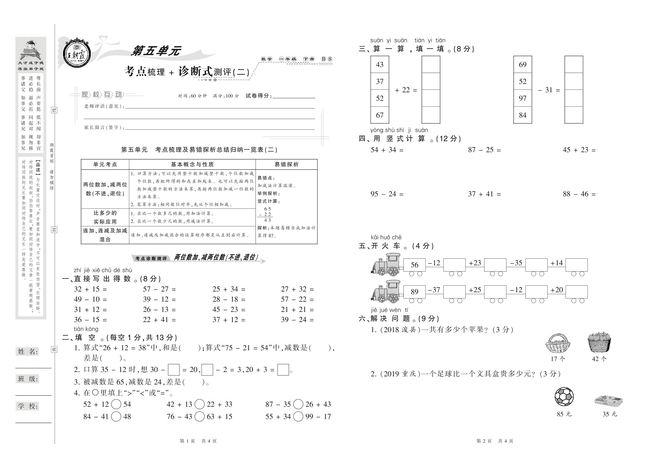 2021下册一年级数学北师版 第五单元 考点梳理+诊断式测评(二)