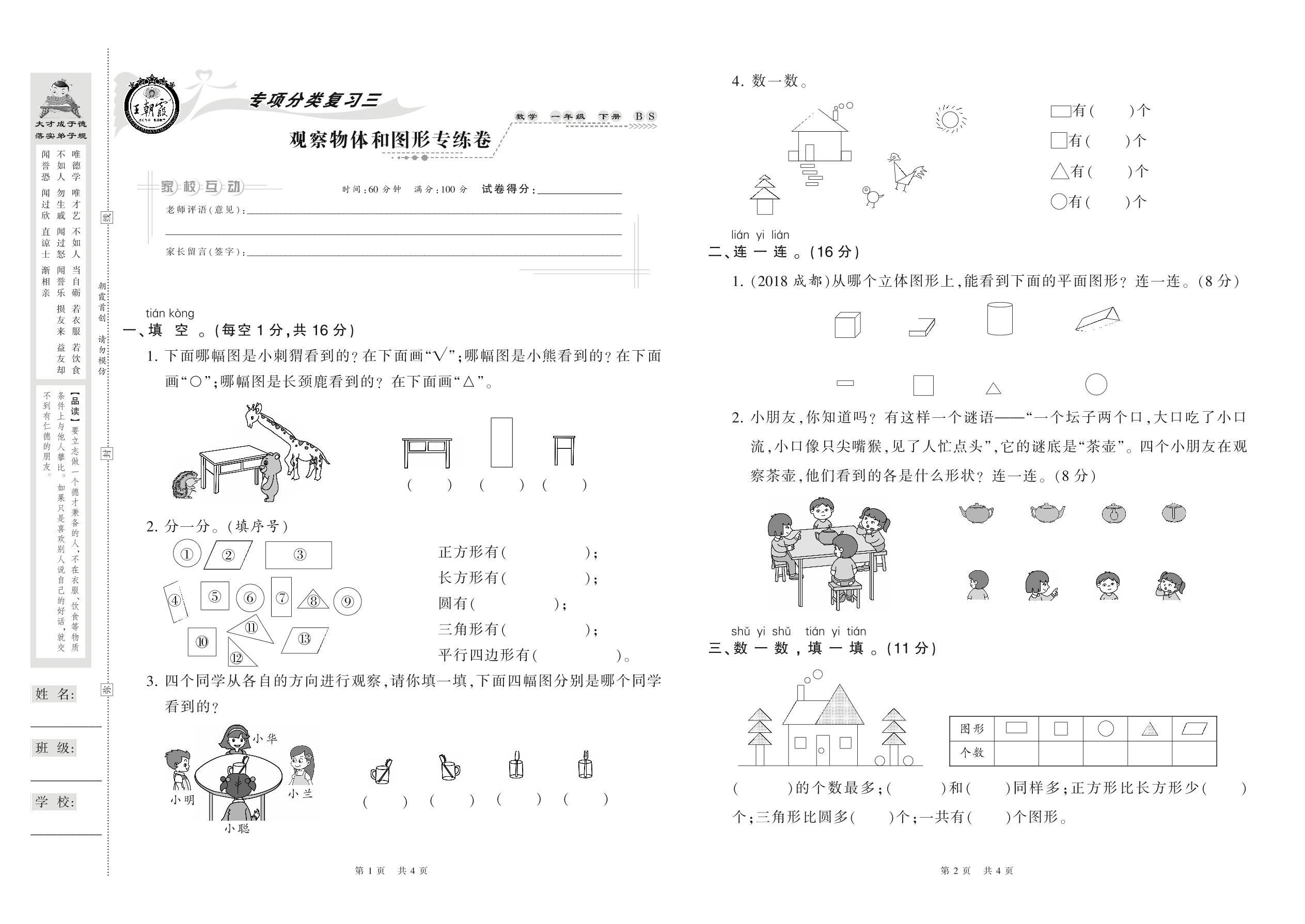 2021下册一年级数学北师版 观察物体和图形专练卷