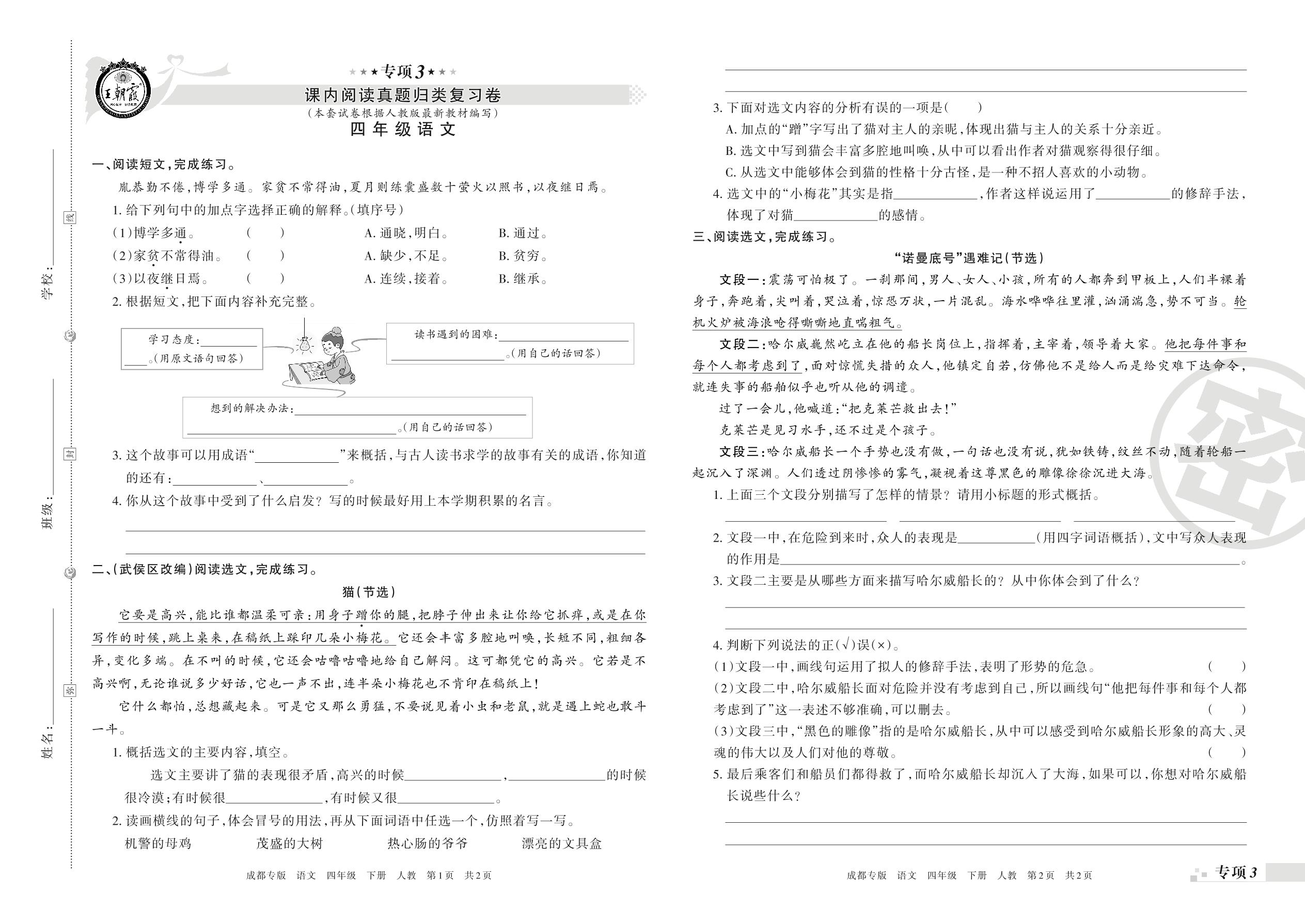王朝霞期末专项卷——课内阅读、课外阅读真题归类复习四年级下册语文(人教版)_R210801181227【0】