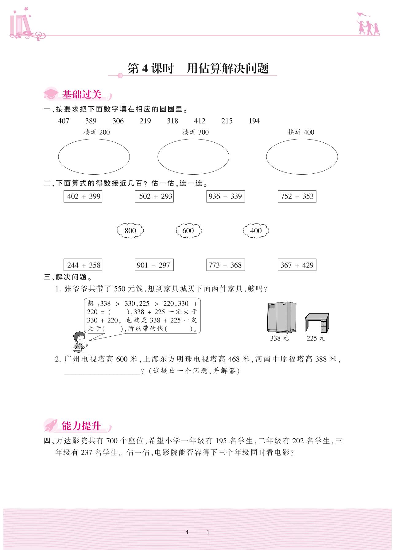 2020上册三年级数学人教版 2 万以内的加法和减法(一)——第4课时 用估算解决问题