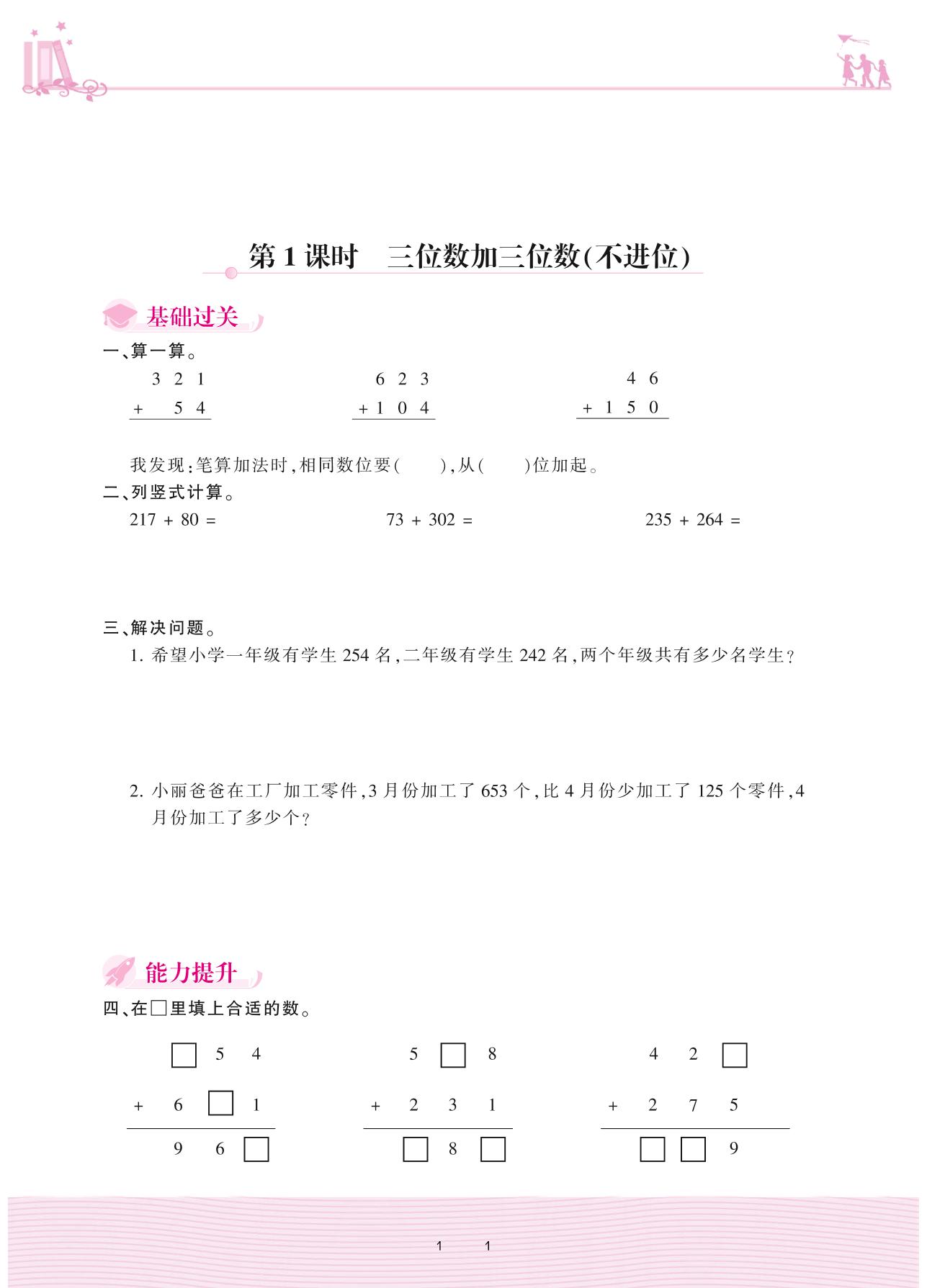 2020上册三年级数学人教版 4 万以内的加法和减法(二) 1. 加法——第1课时 三位数加三位数(不进位)