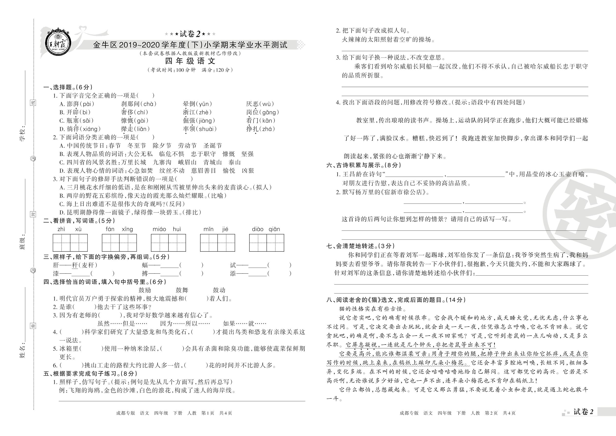 2019-2020学年第二学期成都市金牛区四年级语文试卷(人教版)【2】