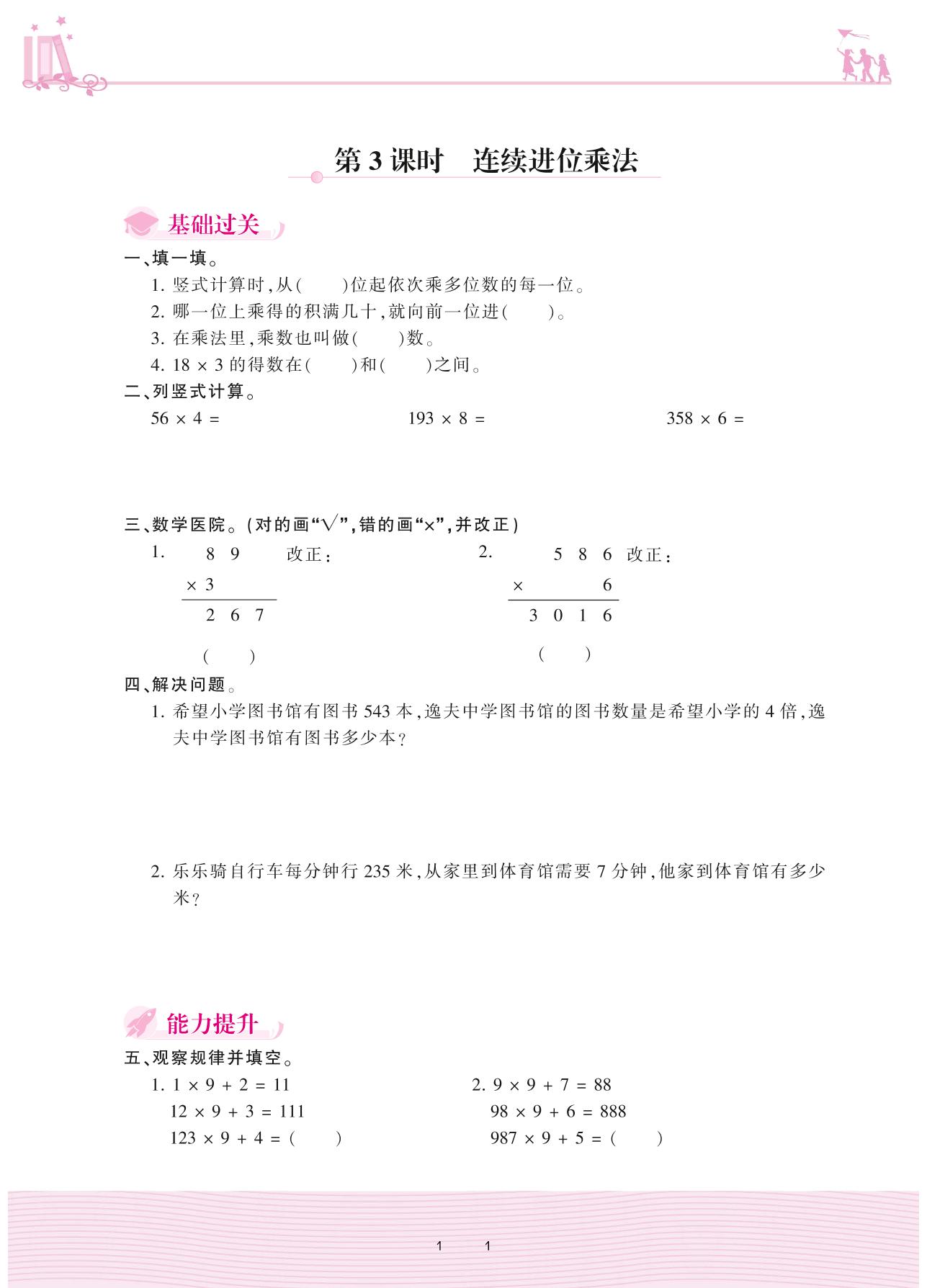 2020上册三年级数学人教版 6 多位数乘一位数 2. 笔算乘法——第3课时 连续进位乘法