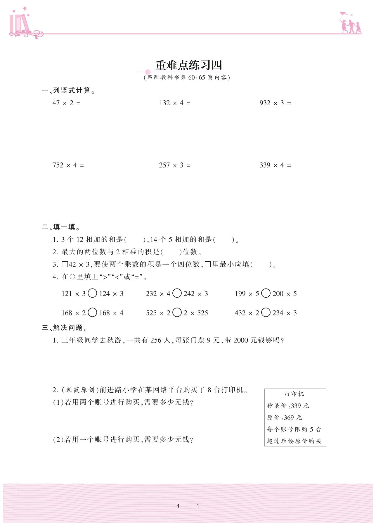 2020上册三年级数学人教版 6 多位数乘一位数——重难点练习四