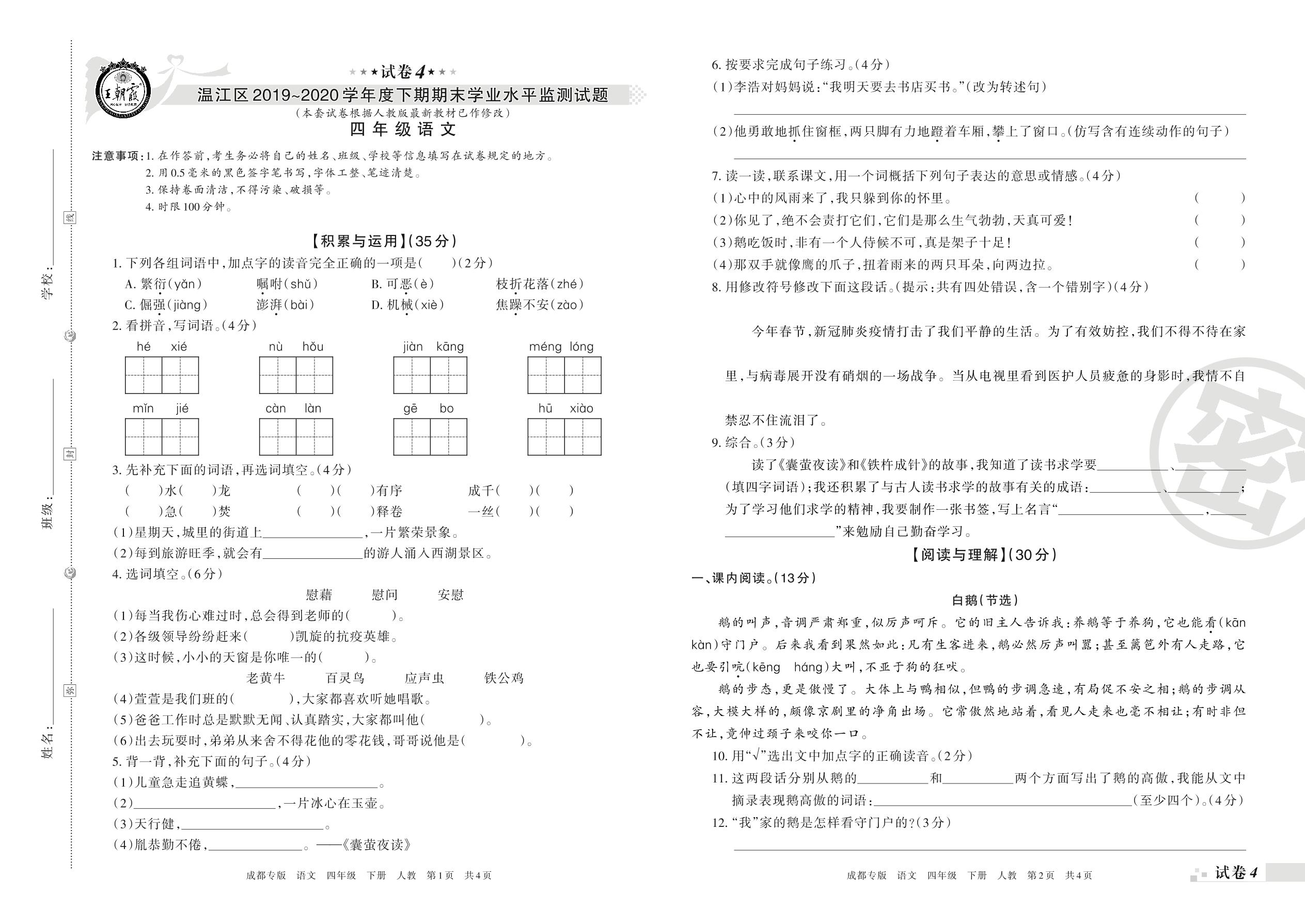2019-2020学年第二学期成都市温江区四年级语文试卷(人教版)【4】