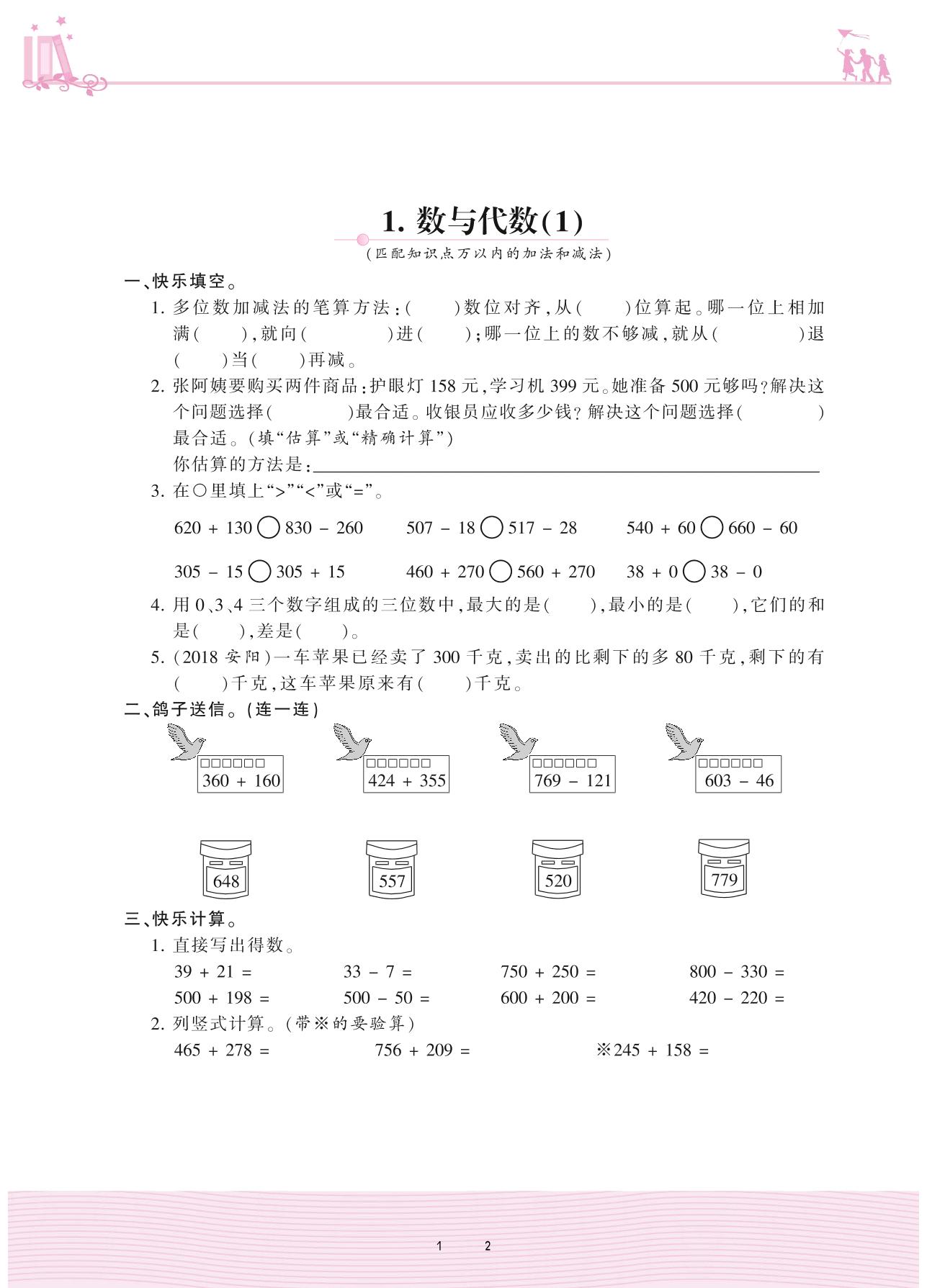 2020上册三年级数学人教版 10 总复习——1. 数与代数(1)