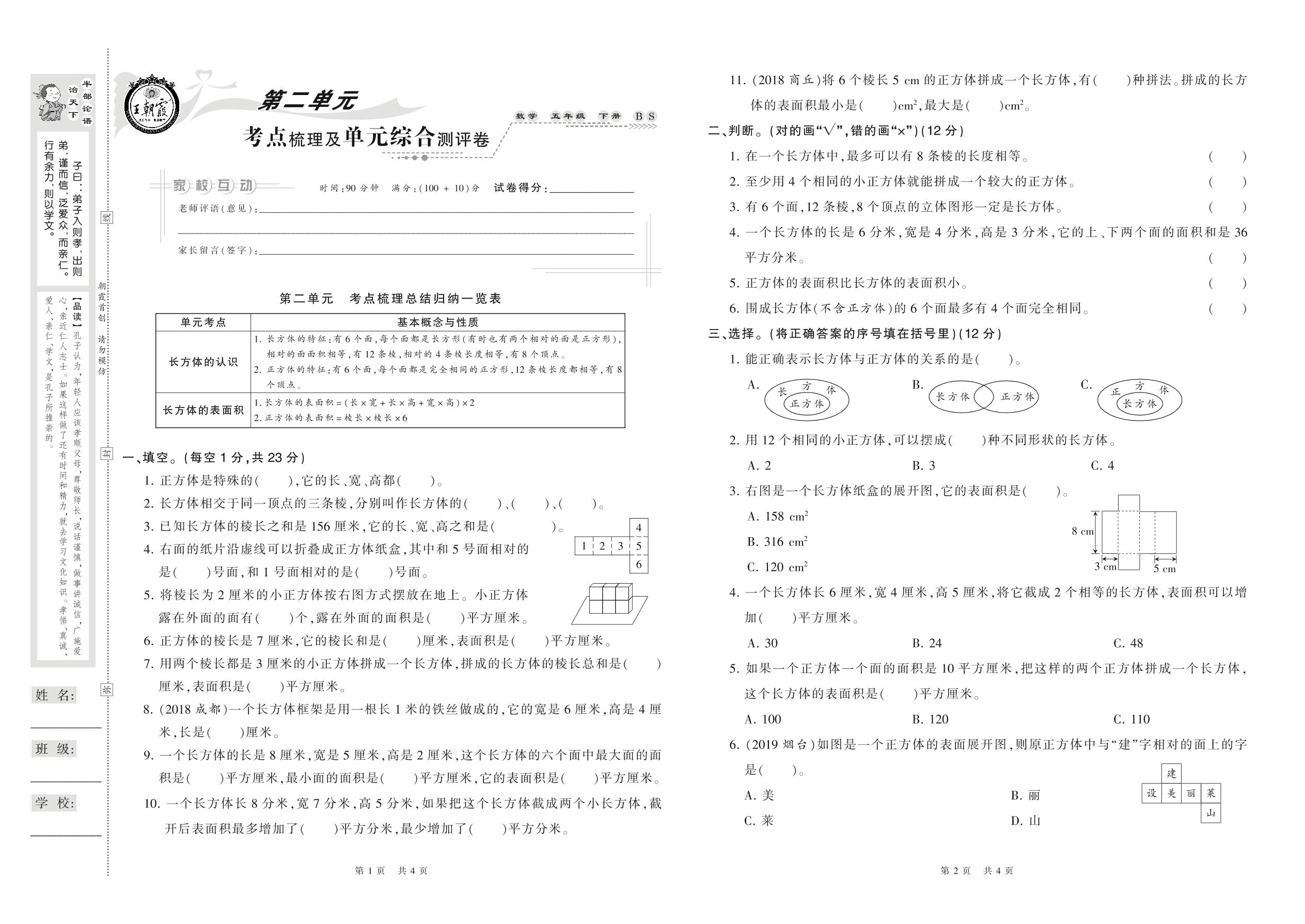 2021下册五年级数学北师版 第二单元 考点梳理及单元综合测评卷