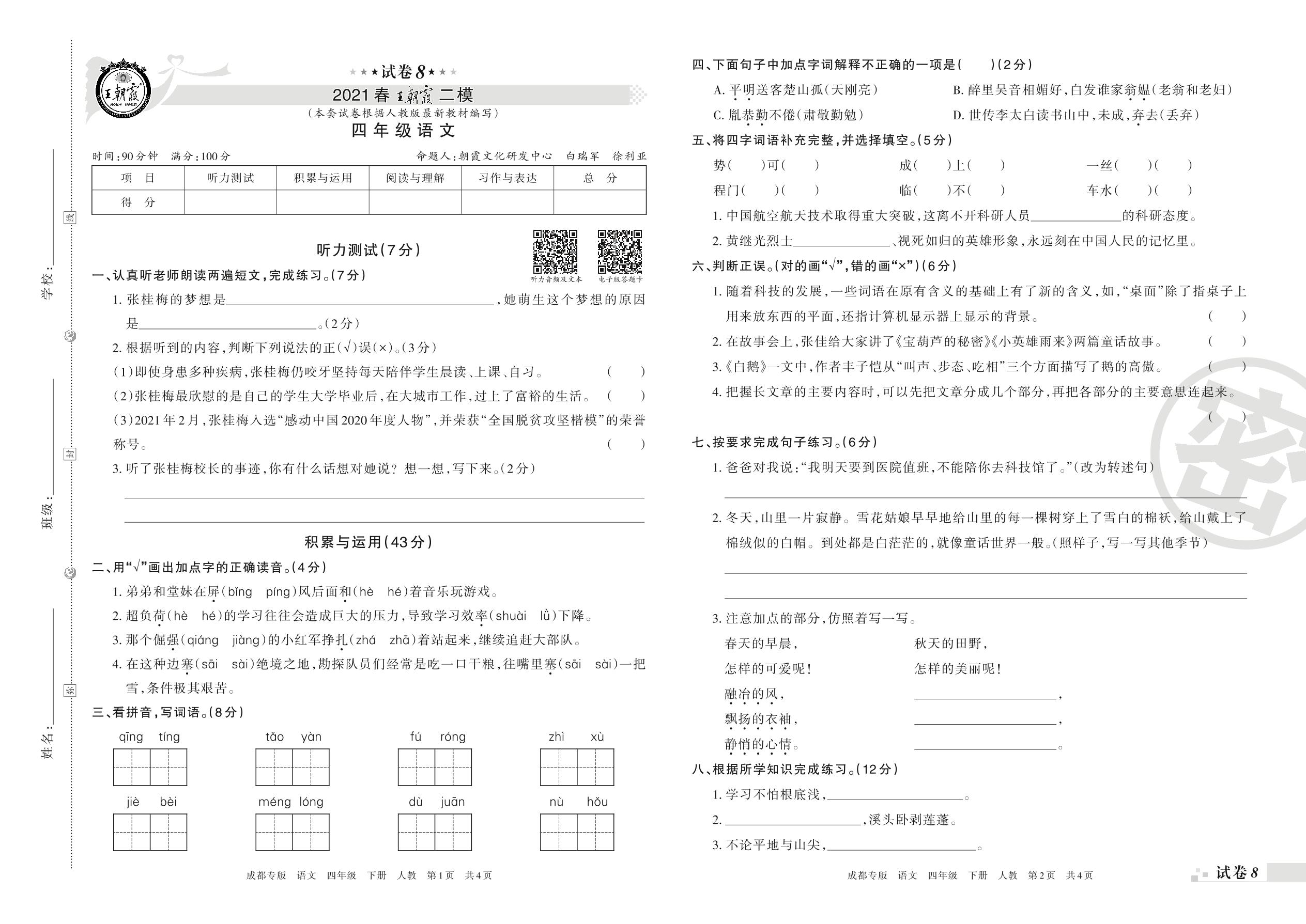 王朝霞期末模拟卷四年级下册语文(人教版)_R210801181315【8】
