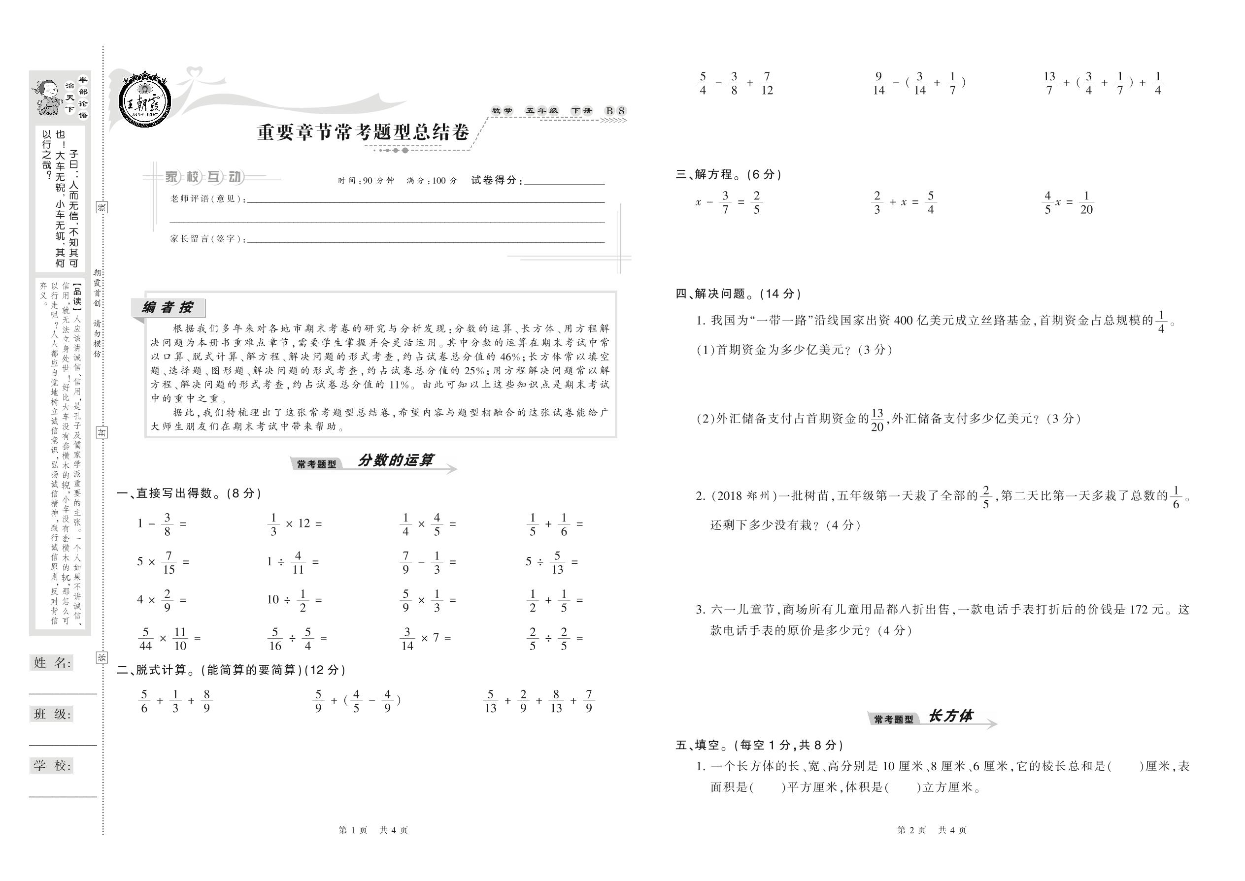 2021下册五年级数学北师版 重要章节常考题型总结卷