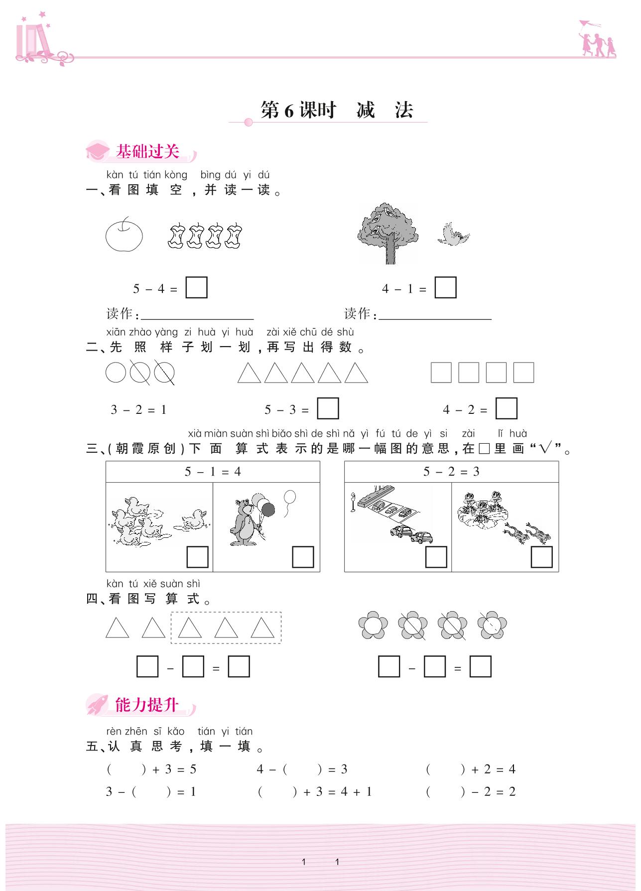 2020上册一年级数学人教版 3 1~5的认识和加减法——第6课时 减法