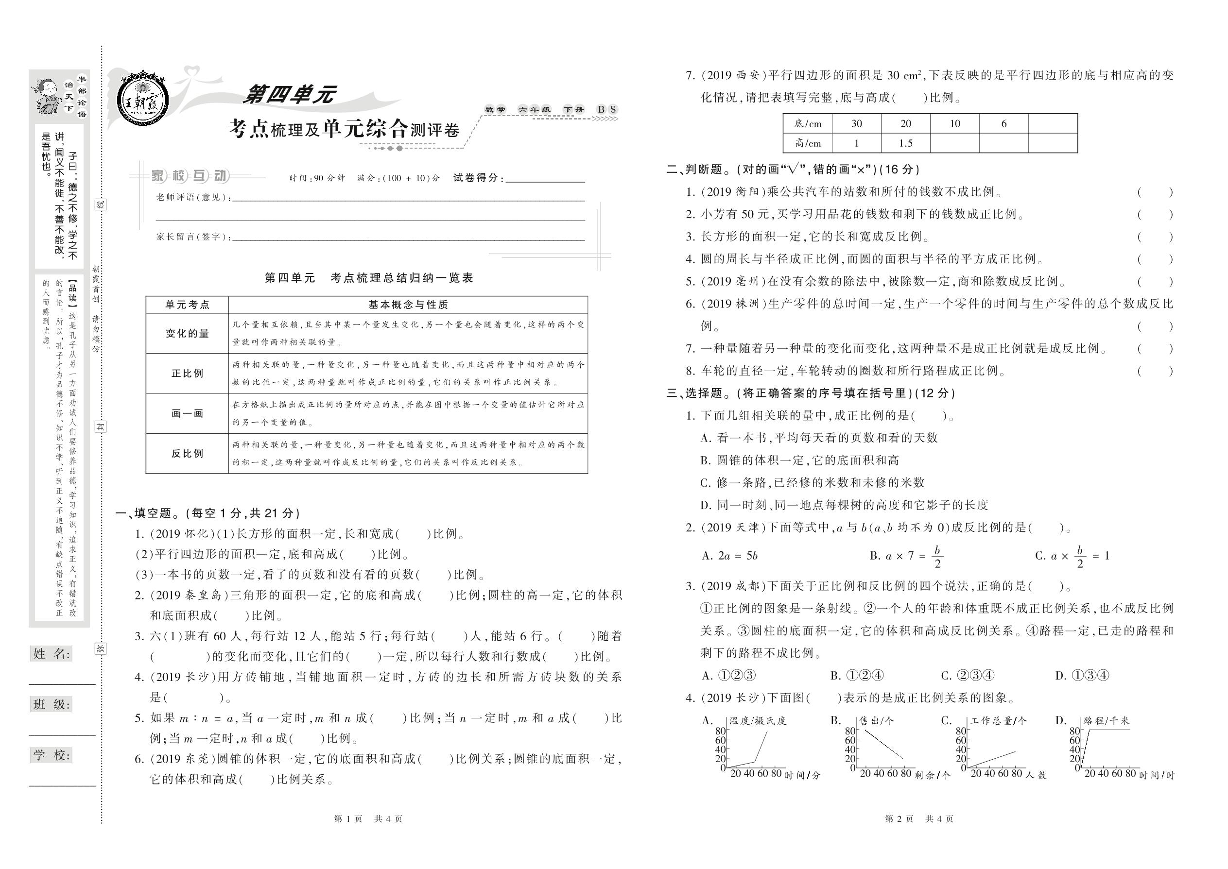 2021下册六年级数学北师版 第四单元 考点梳理及单元综合测评卷