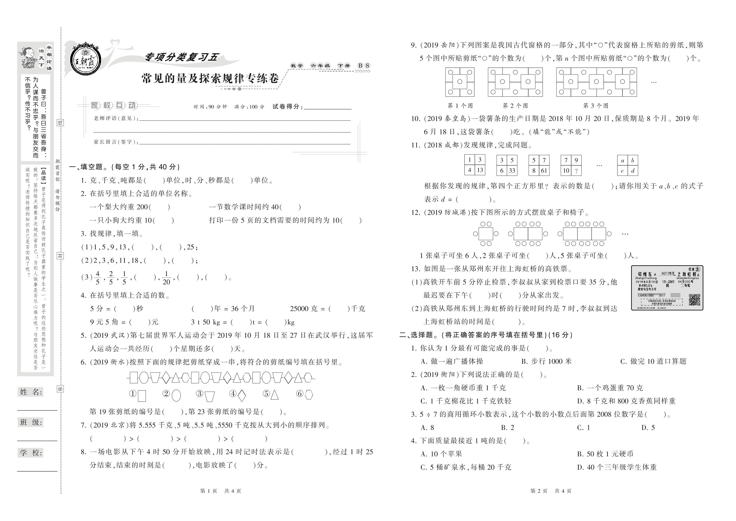 2021下册六年级数学北师版 常见的量及探索规律专练卷