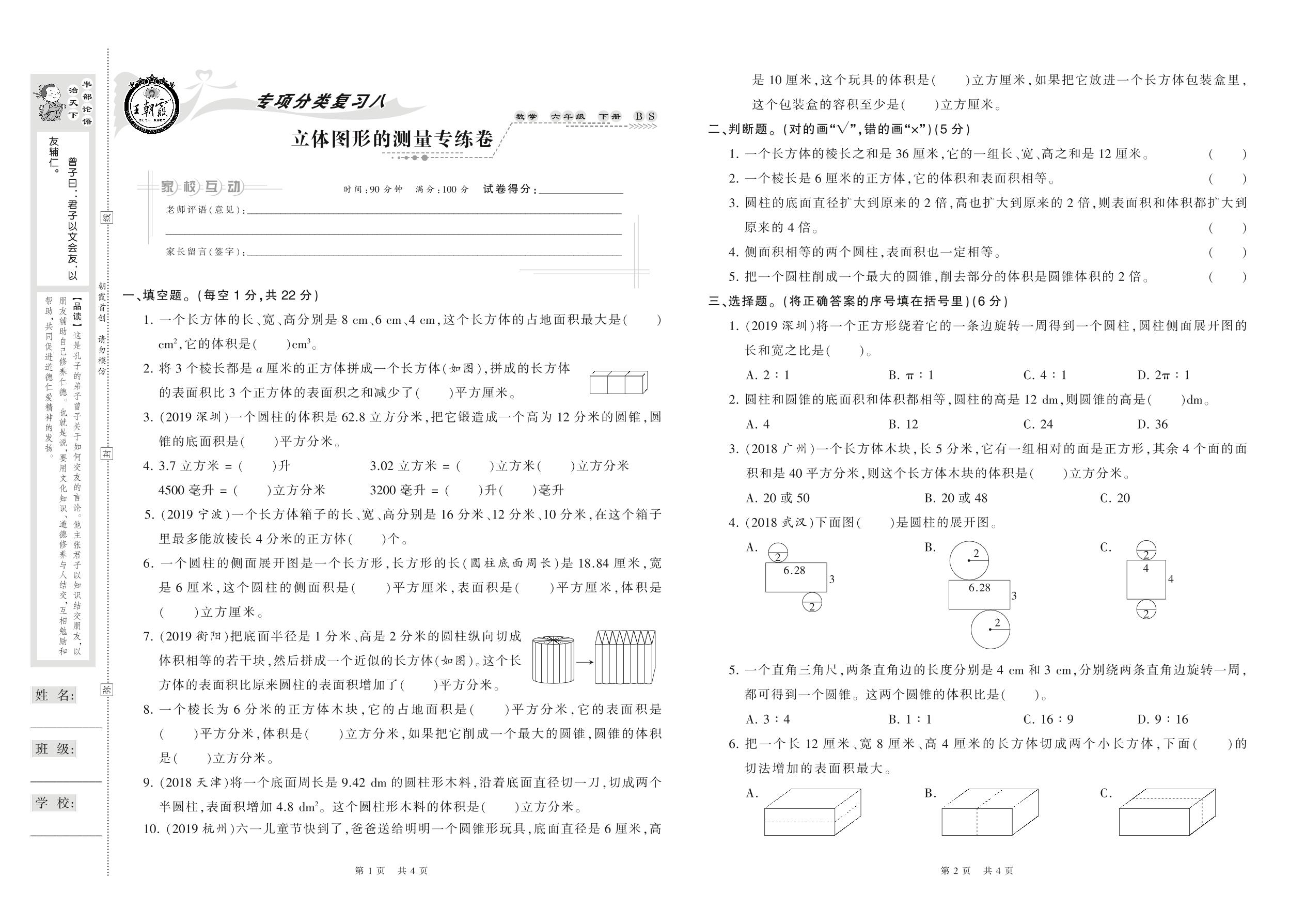 2021下册六年级数学北师版 立体图形的测量专练卷