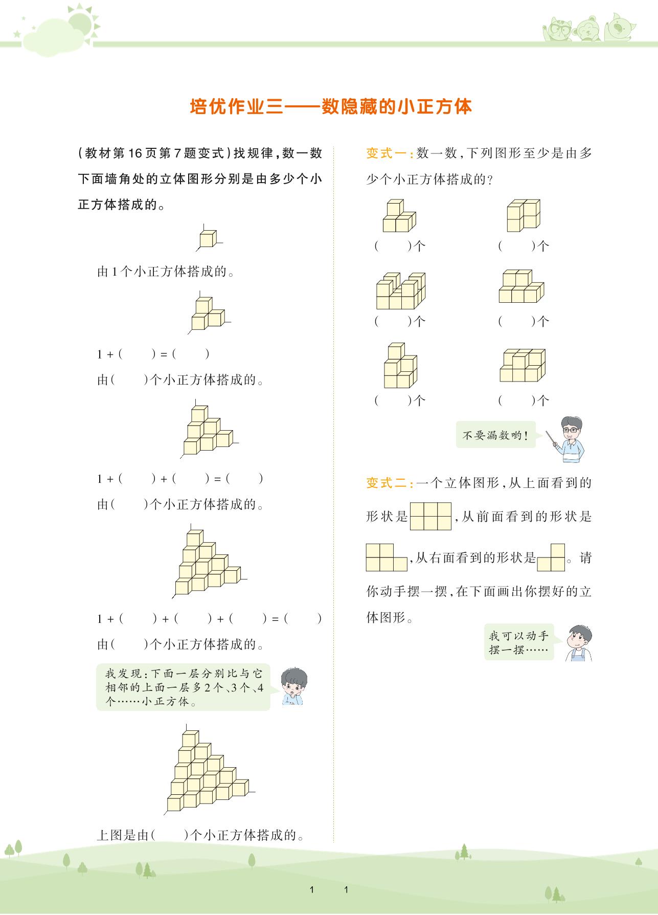 2021下册一年级数学人教版 第二单元 观察物体(二)——培优作业三 数隐藏的小正方体