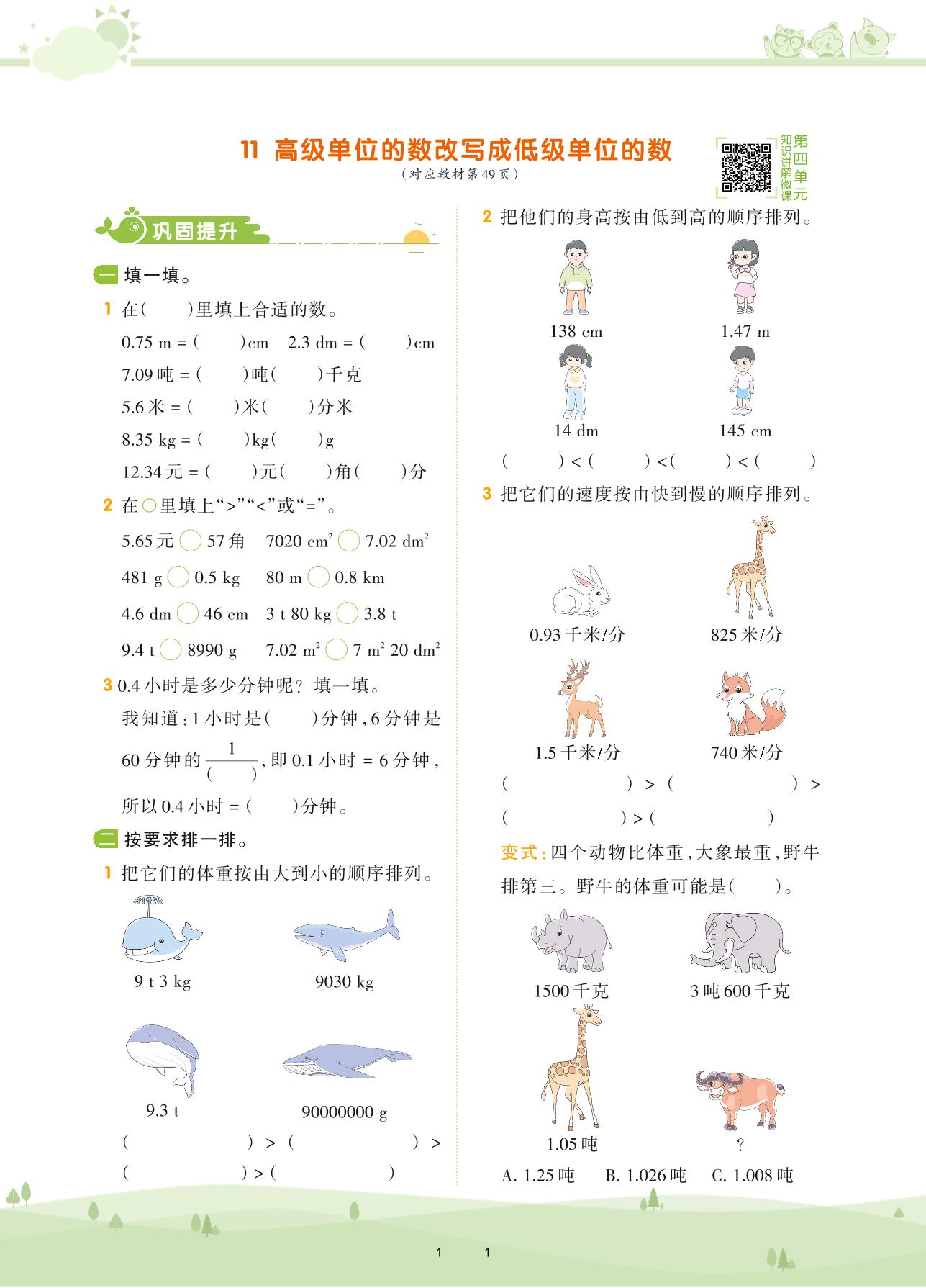 2021下册一年级数学人教版 第四单元 小数的意义和性质——11 高级单位的数改写成低级单位的数