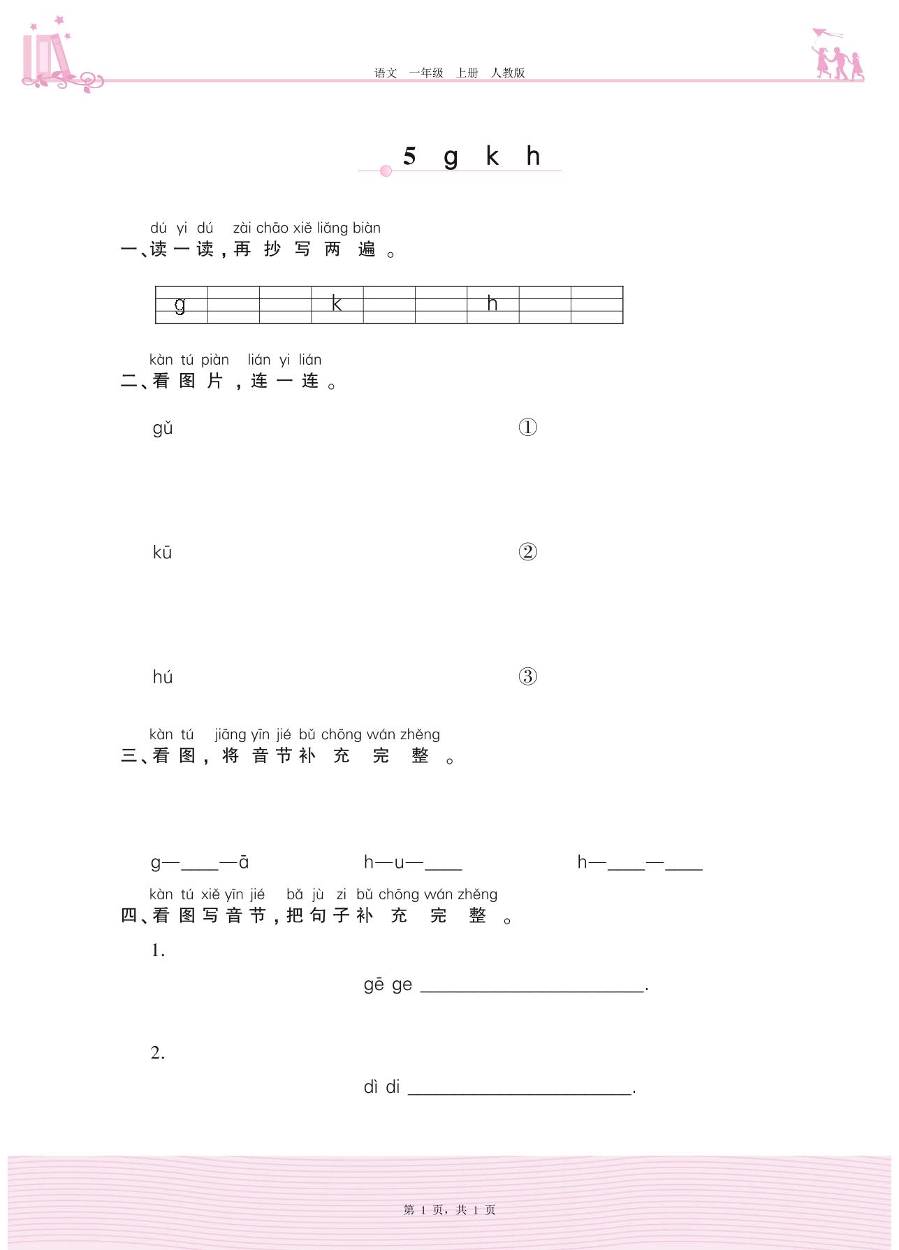 2020上册一年级语文人教版 第二单元 汉语拼音——5 g k h
