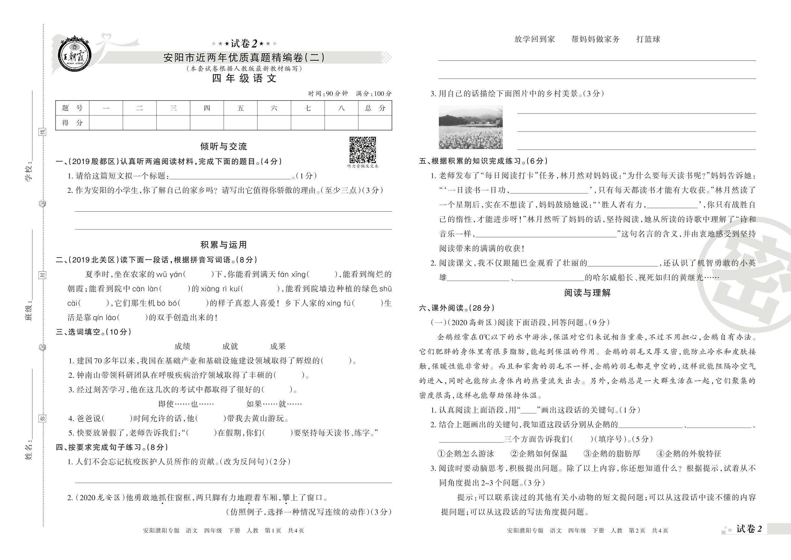 安阳市近两年优质真题精编卷(二)四年级下册语文(人教版)【2】