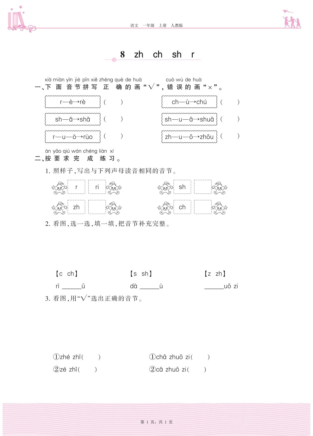 2020上册一年级语文人教版 第二单元 汉语拼音——8 zh ch sh r