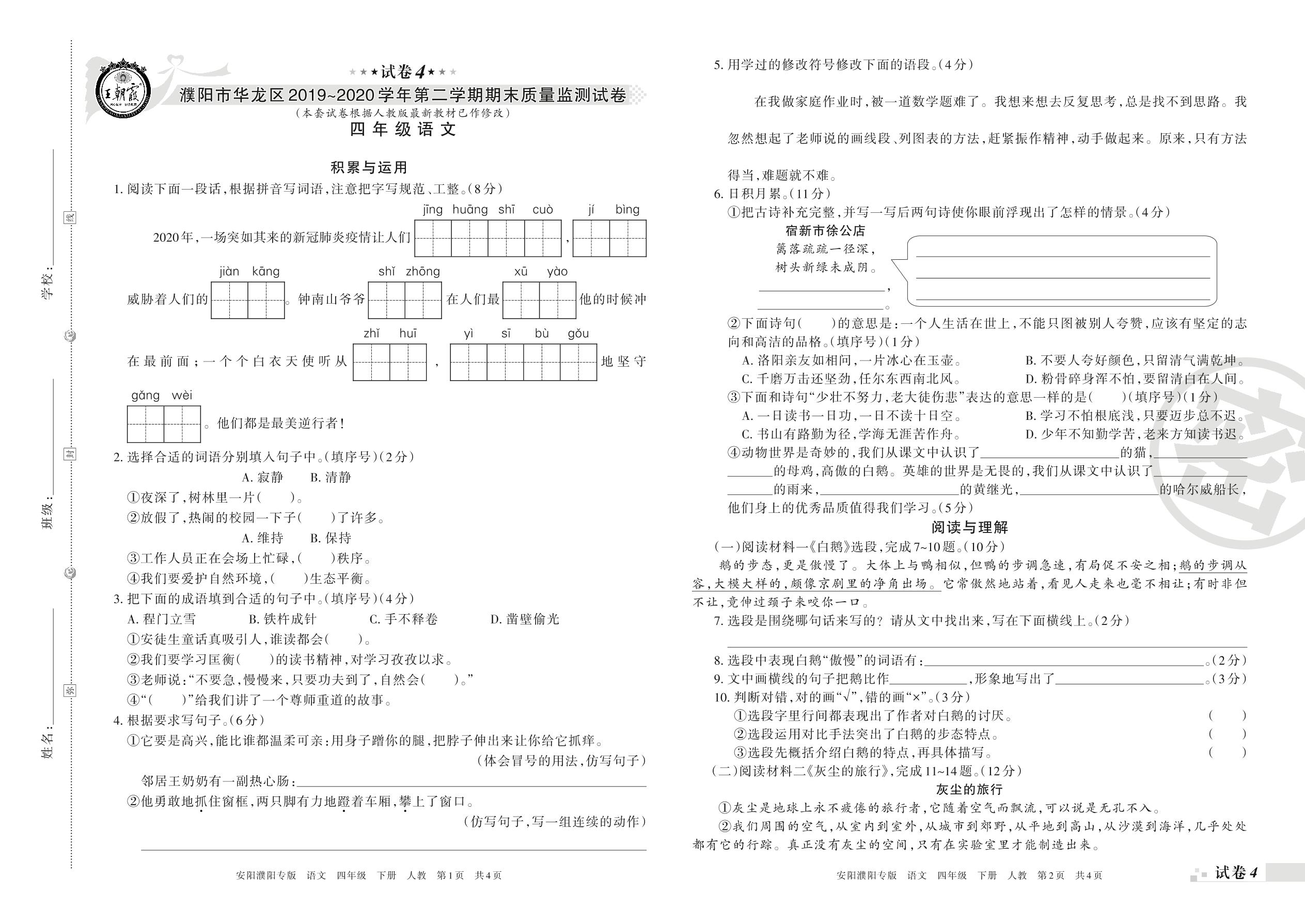 2019-2020学年第二学期濮阳市华龙区四年级语文试卷(人教版)【4】