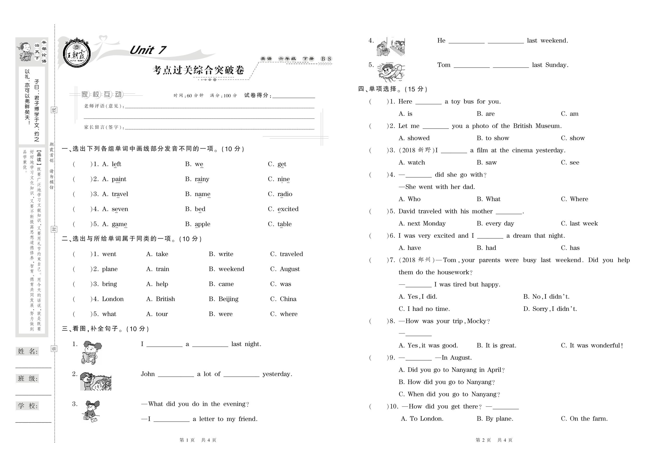 2021下册六年级英语北师版 Unit 7 考点过关综合突破卷