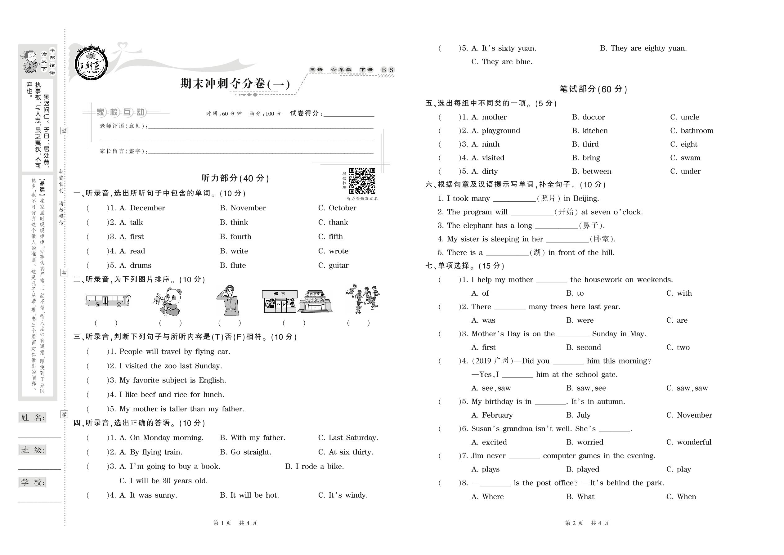 2021下册六年级英语北师版 期末冲刺夺分卷(一)
