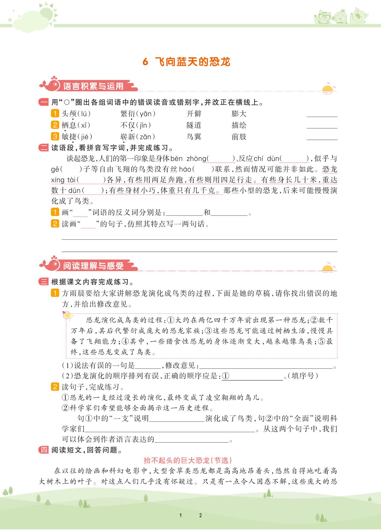 2021下册四年级语文人教版 第二单元——6 飞向蓝天的恐龙
