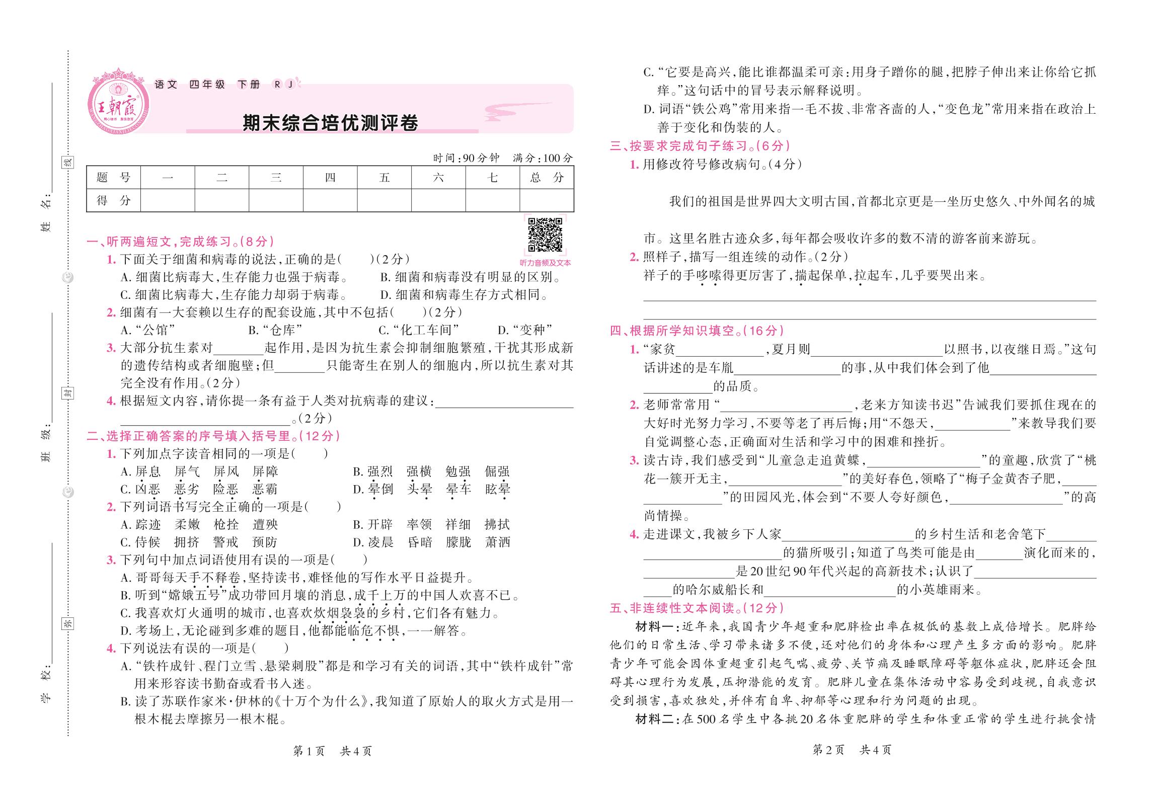 四年级语文人教版下册期末卷