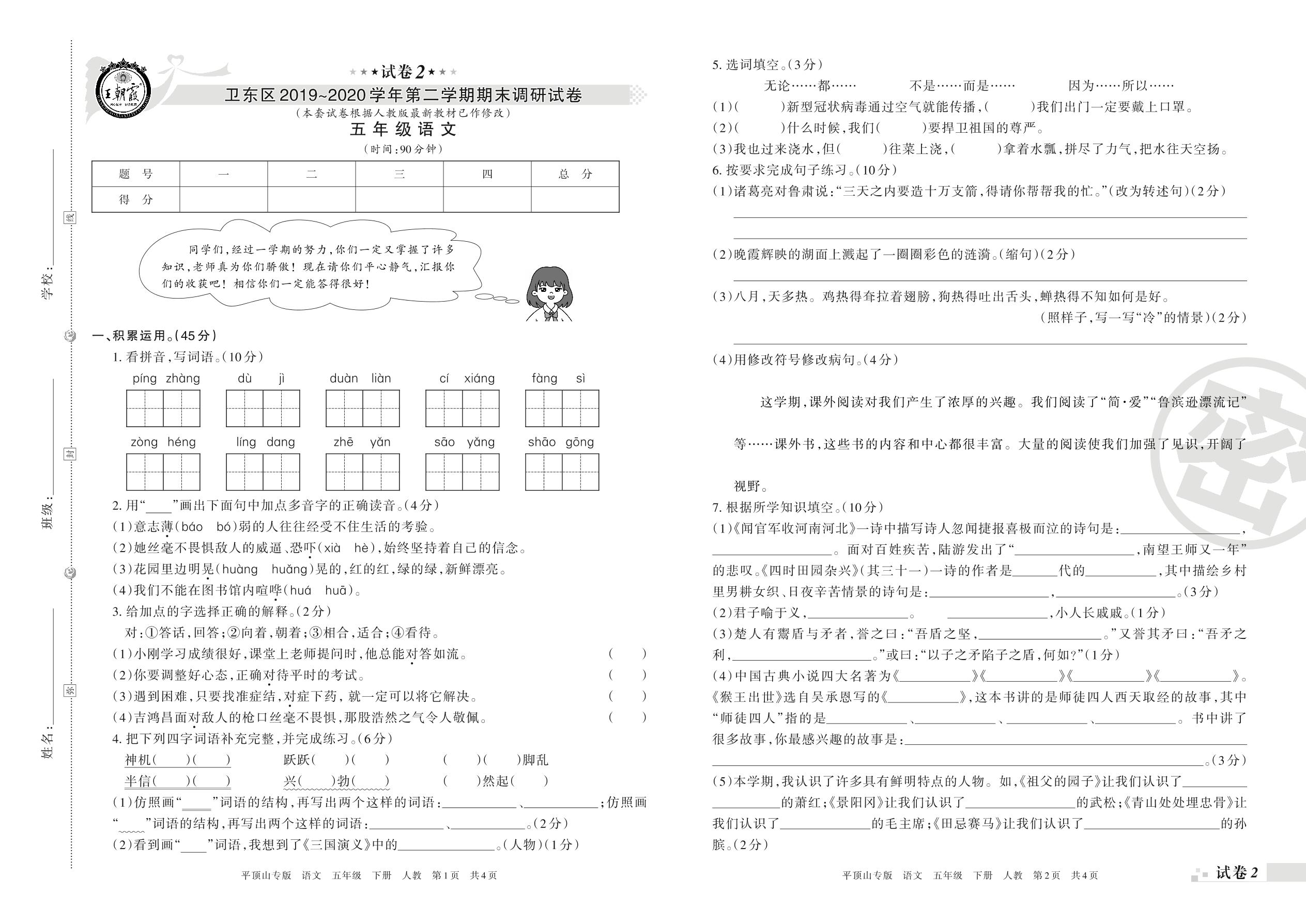 2019-2020学年第二学期平顶山市卫东区五年级语文试卷(人教版)【2】