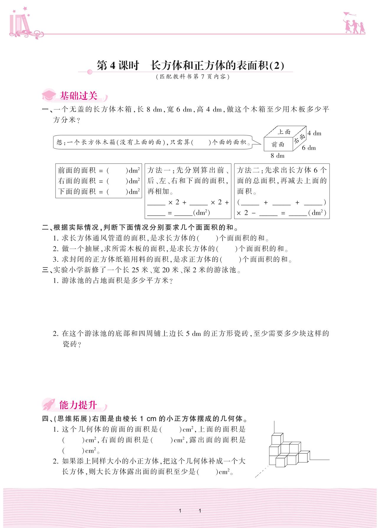 2020上册六年级数学苏教版 一 长方体和正方体——第4课时 长方体和正方体的表面积