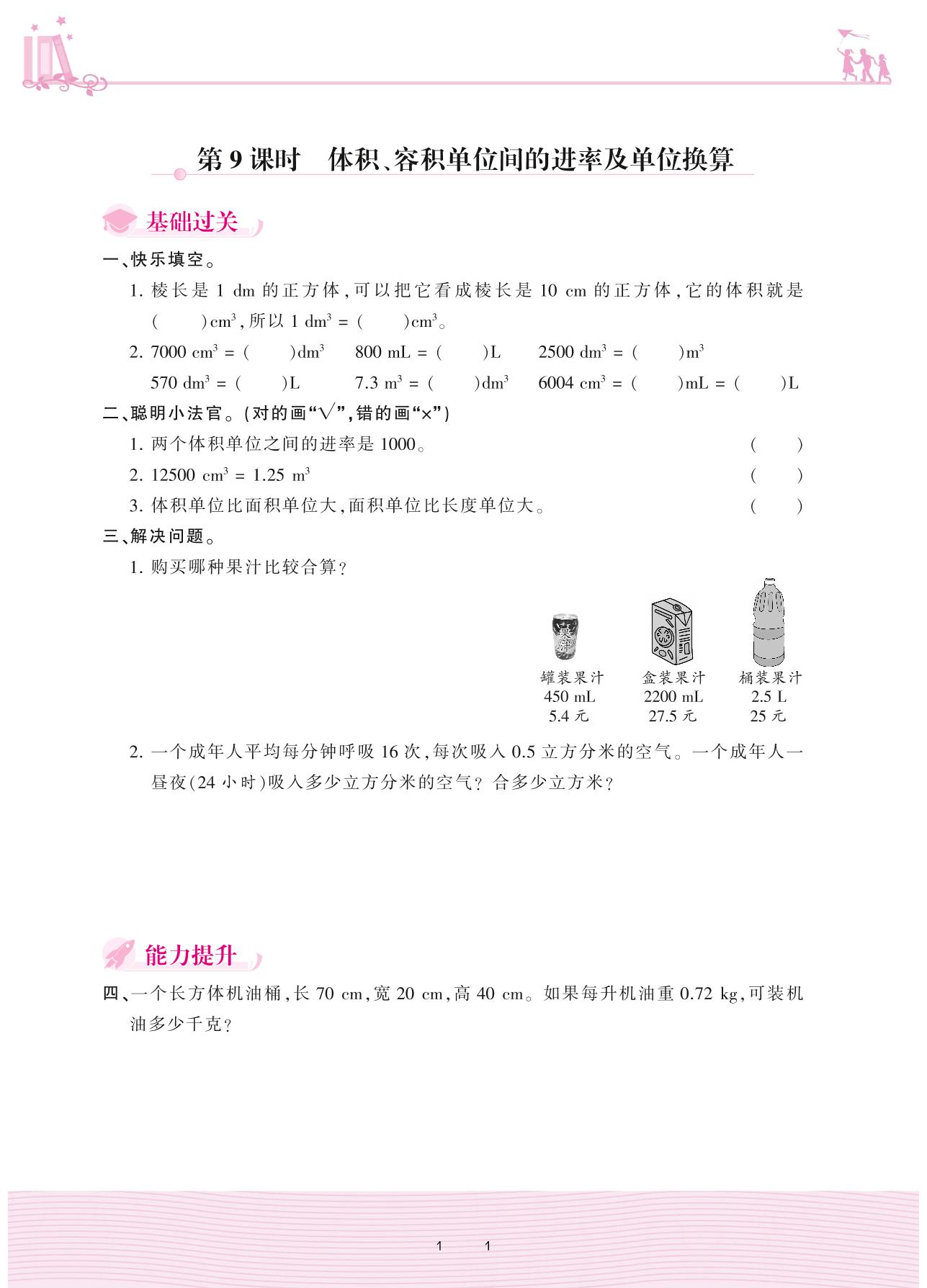 2020上册六年级数学苏教版 一 长方体和正方体——第9课时 体积、容积单位间的进率及单位换算