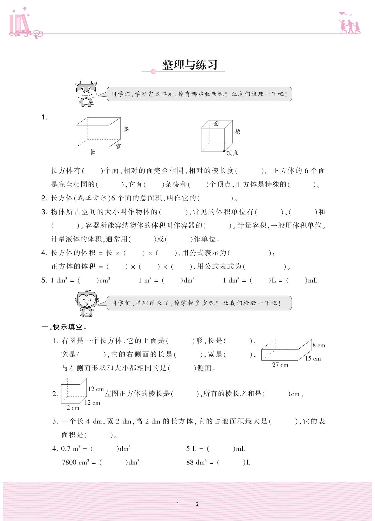 2020上册六年级数学苏教版 一 长方体和正方体——整理与练习