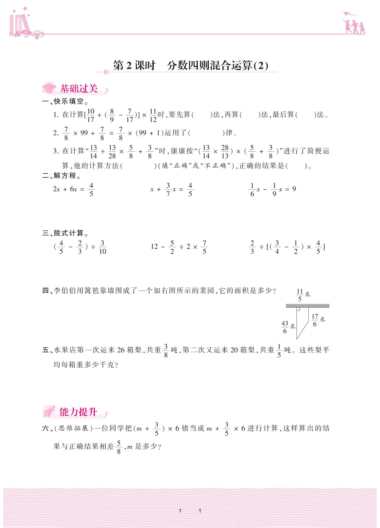 2020上册六年级数学苏教版 五 分数四则混合运算——第2课时 分数四则混合运算(2)