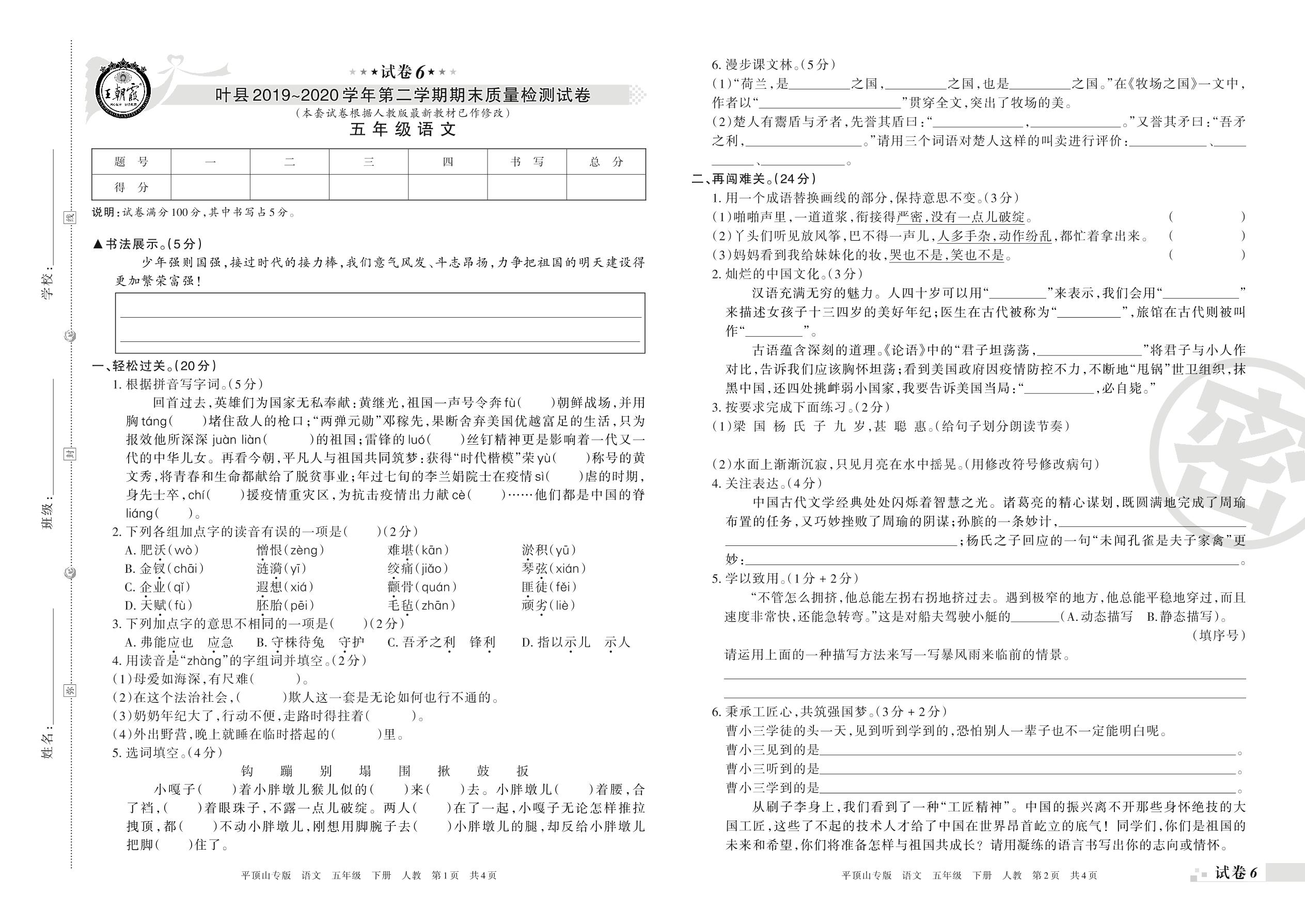 2019-2020学年第二学期平顶山市叶县五年级语文试卷(人教版)【6】