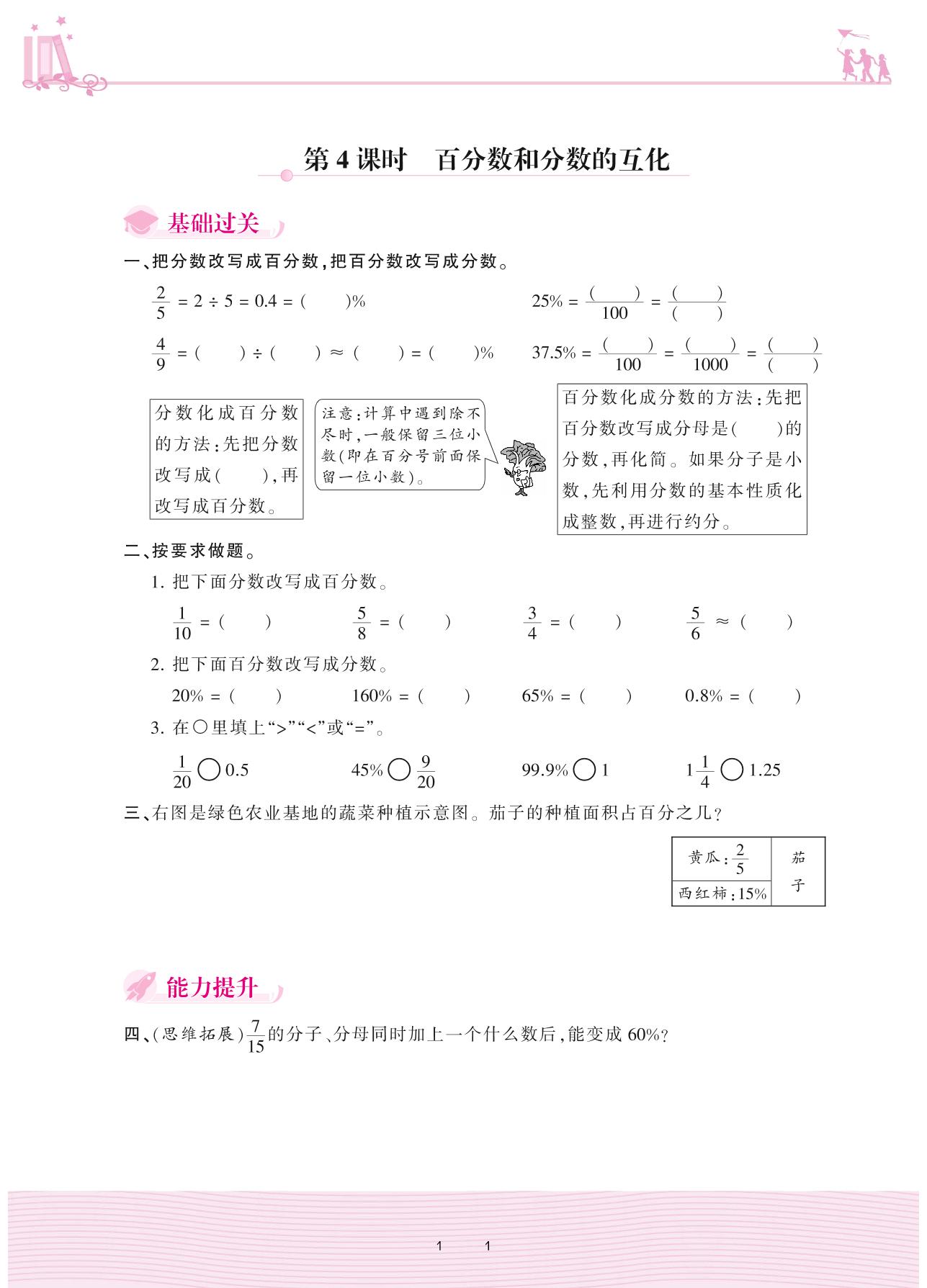 2020上册六年级数学苏教版 六 百分数——第4课时 百分数和分数的互化