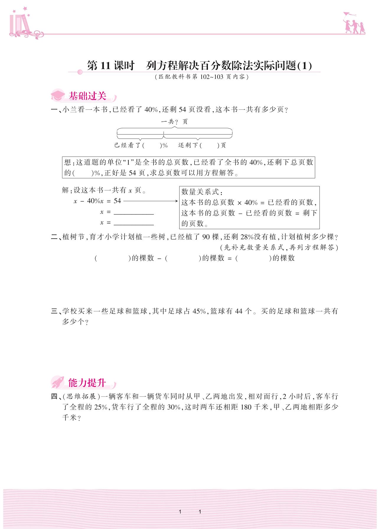 2020上册六年级数学苏教版 六 百分数——第11课时 列方程解决百分数除法实际问题(1)