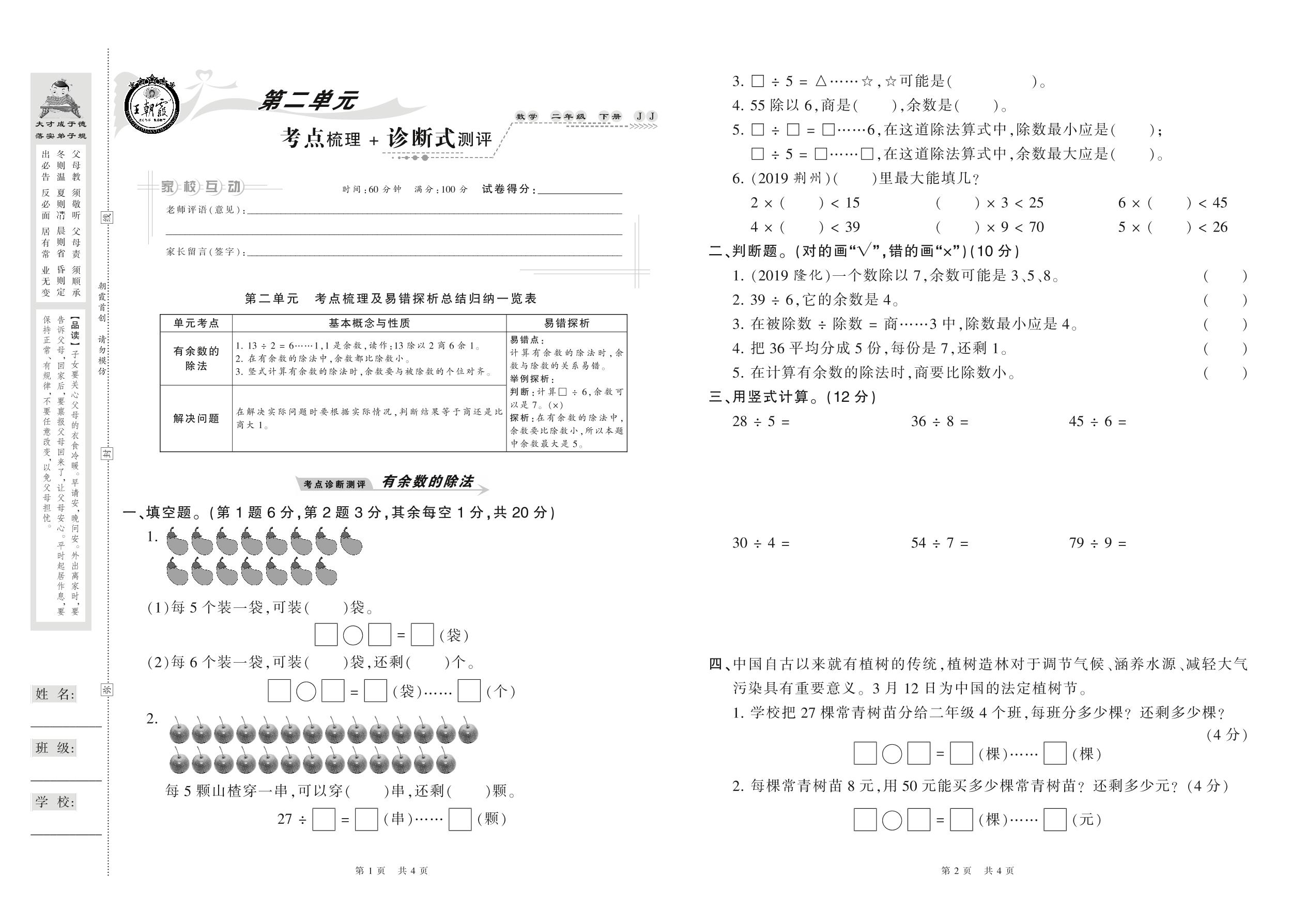 2021下册二年级数学冀教版 第二单元 考点梳理+诊断式测评