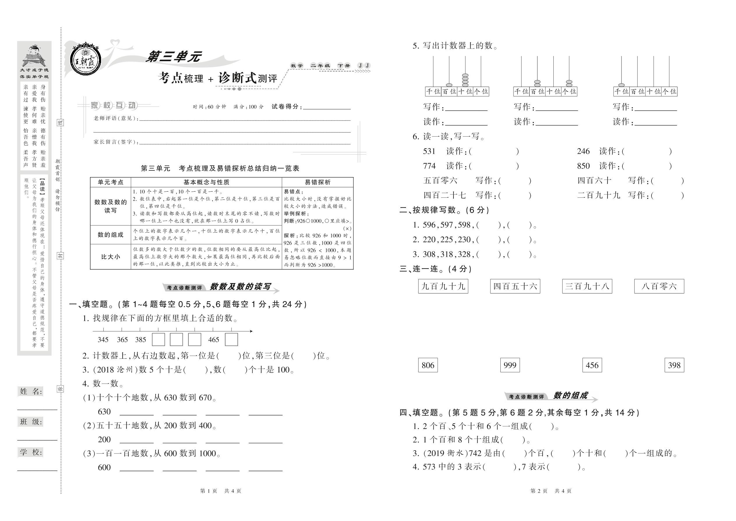 2021下册二年级数学冀教版 第三单元 考点梳理+诊断式测评