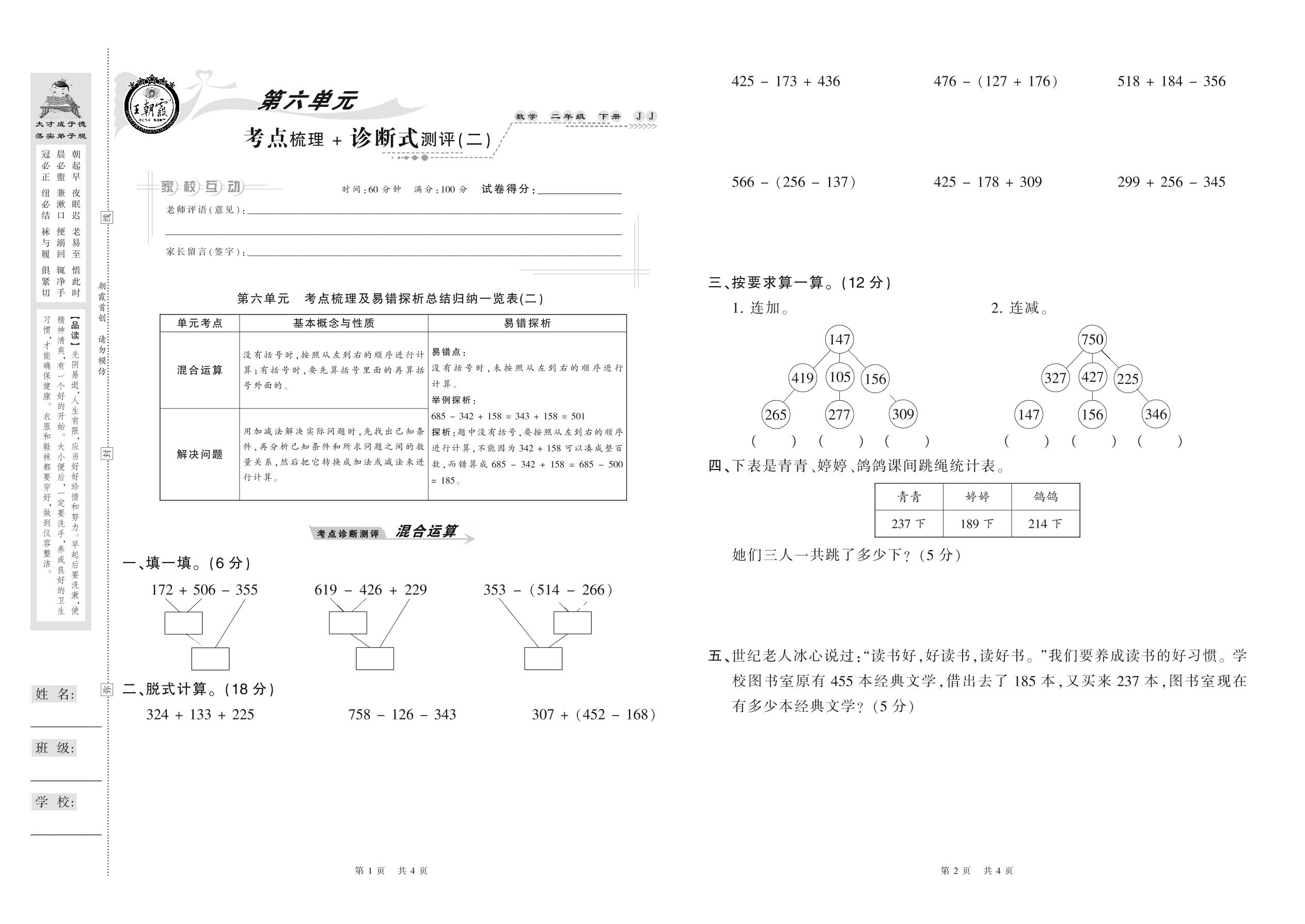 2021下册二年级数学冀教版 第六单元 考点梳理+诊断式测评(二)