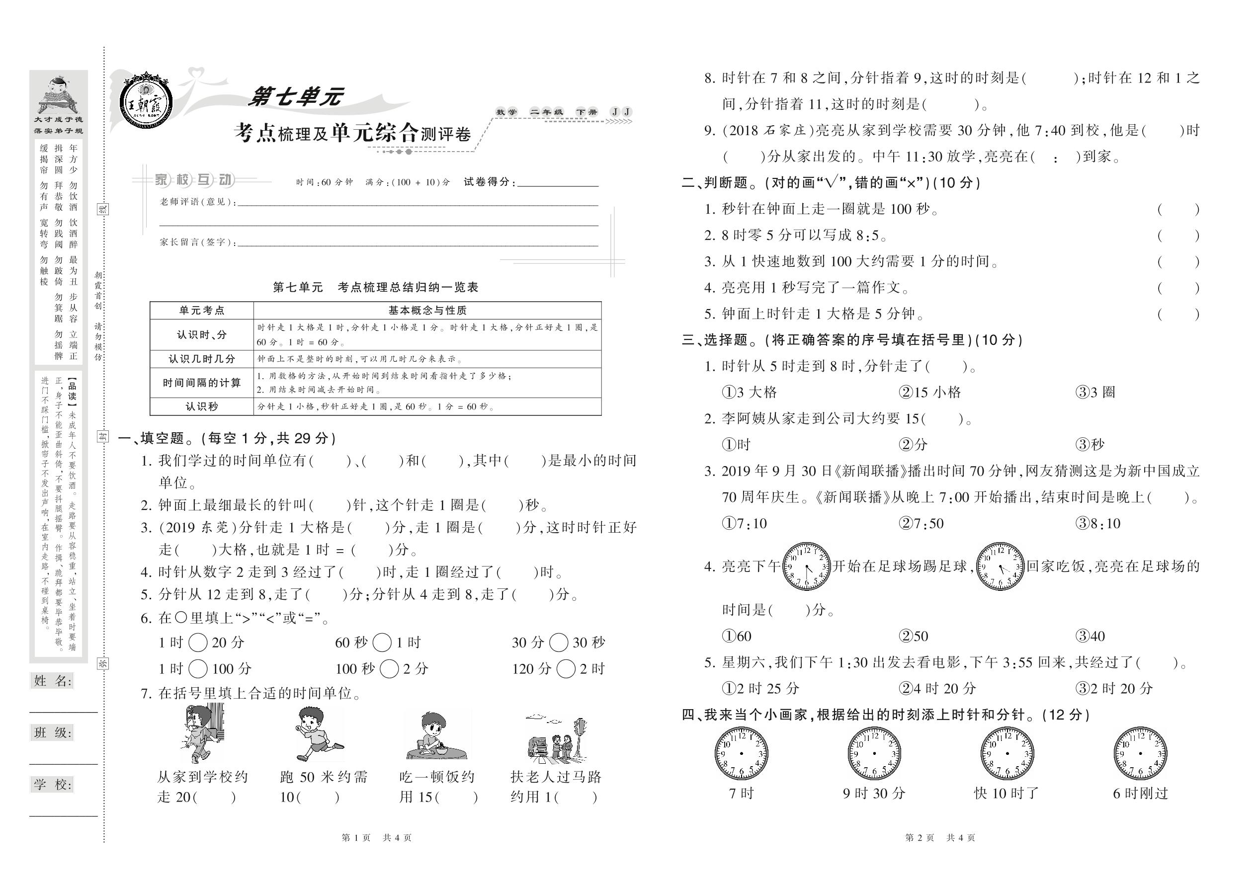2021下册二年级数学冀教版 第七单元 考点梳理及单元综合测评卷
