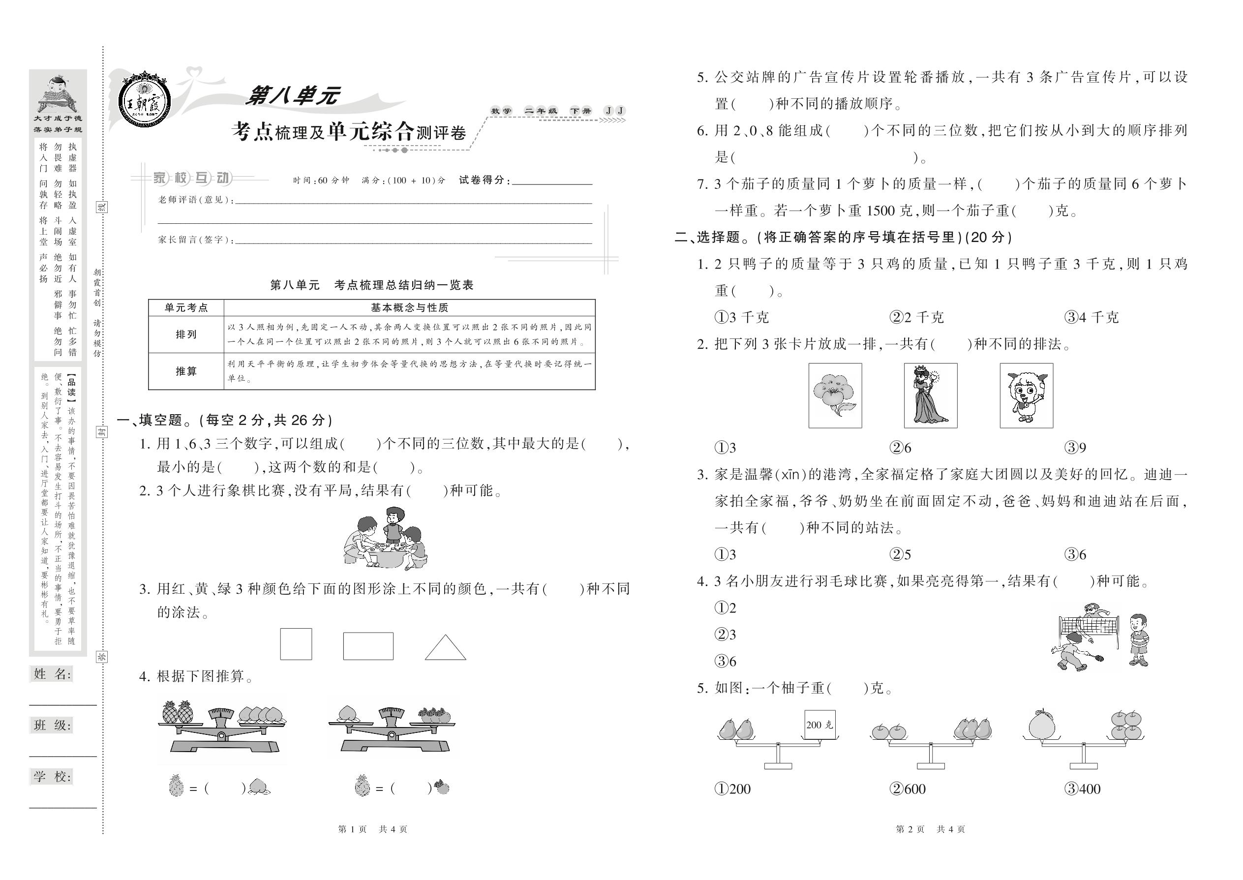 2021下册二年级数学冀教版 第八单元 考点梳理及单元综合测评卷