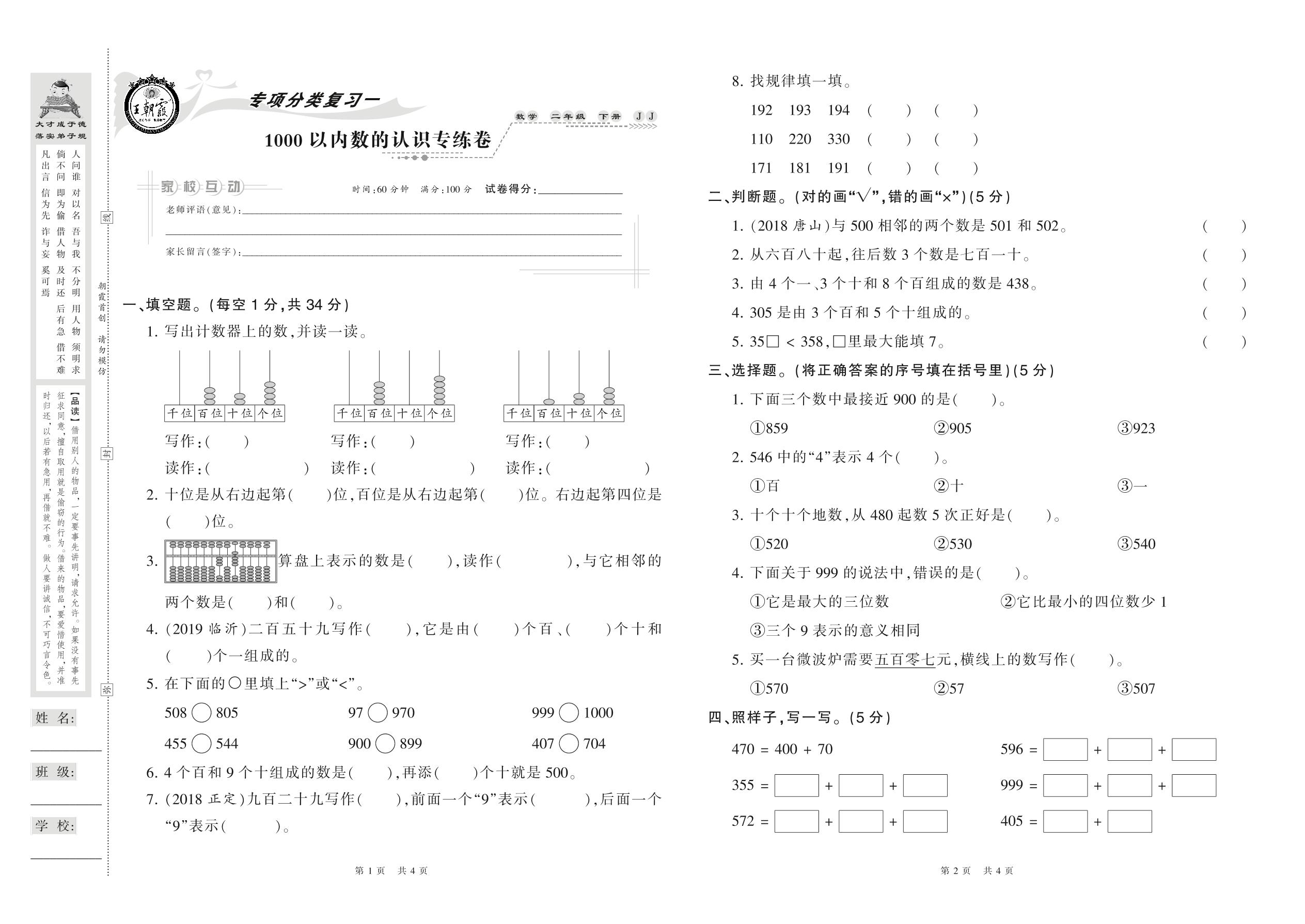 2021下册二年级数学冀教版 1000以内数的认识专练卷