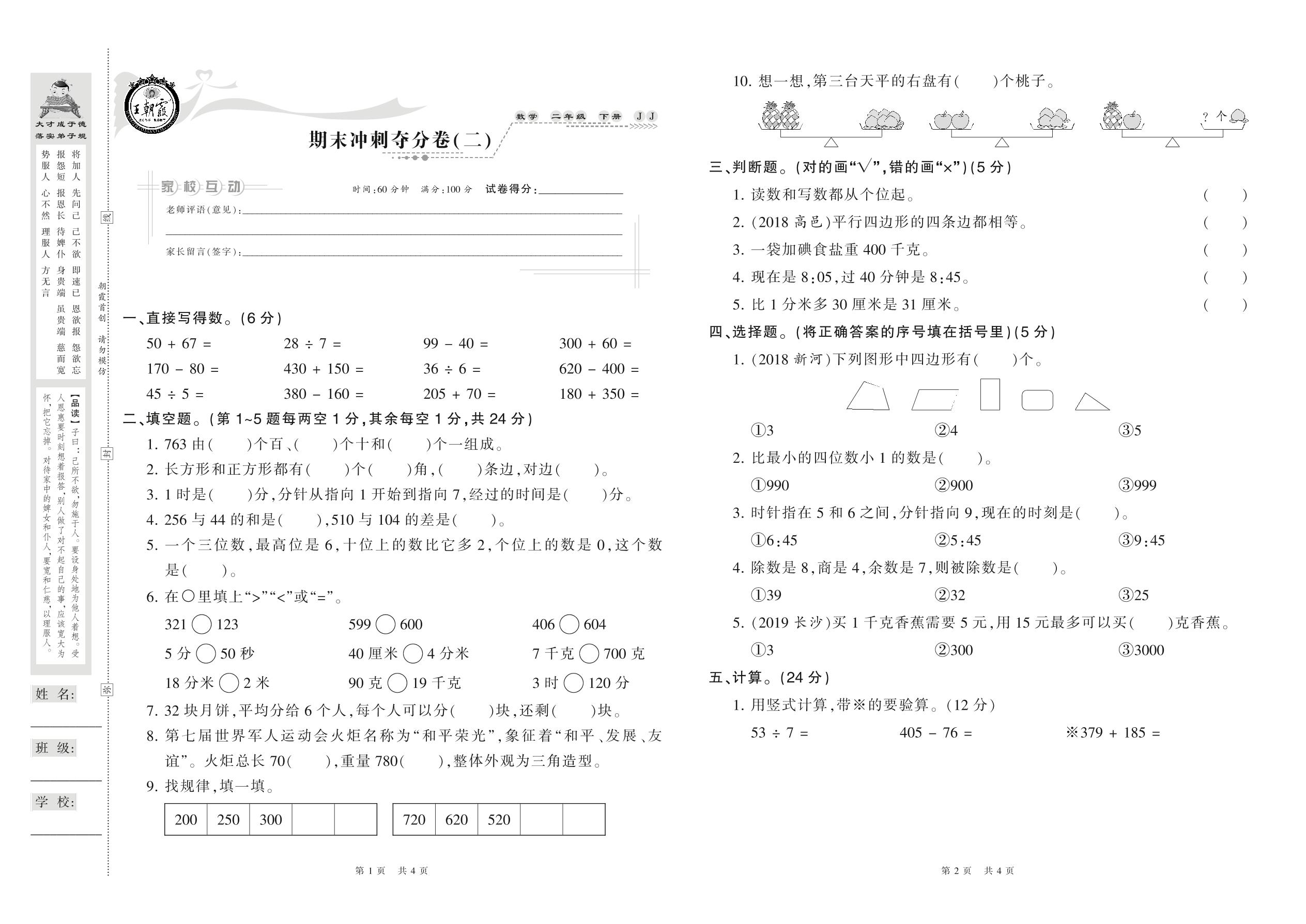 2021下册二年级数学冀教版 期末冲刺夺分卷(二)
