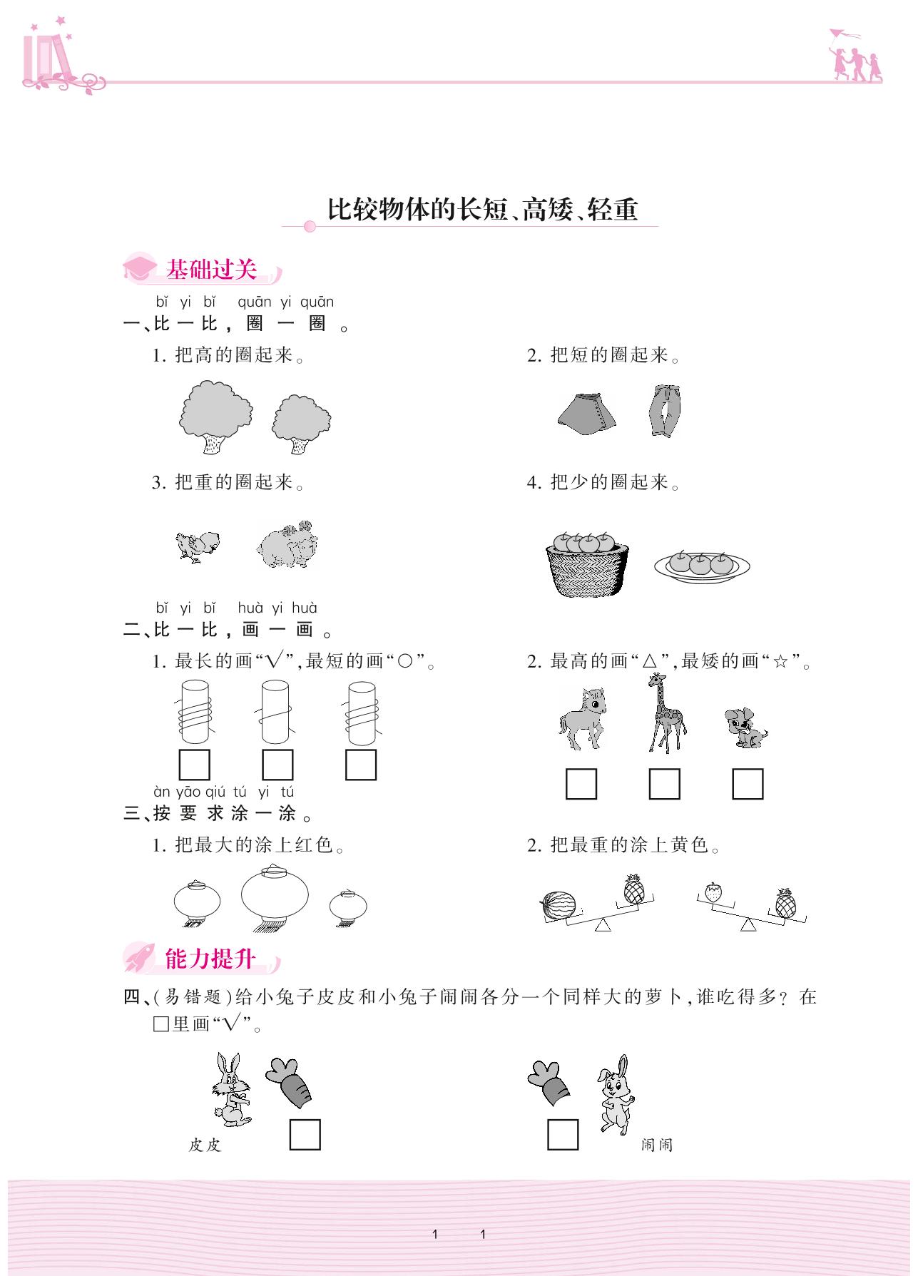 2020上册一年级数学苏教版 二 比一比——比较物体的长短、高矮、轻重
