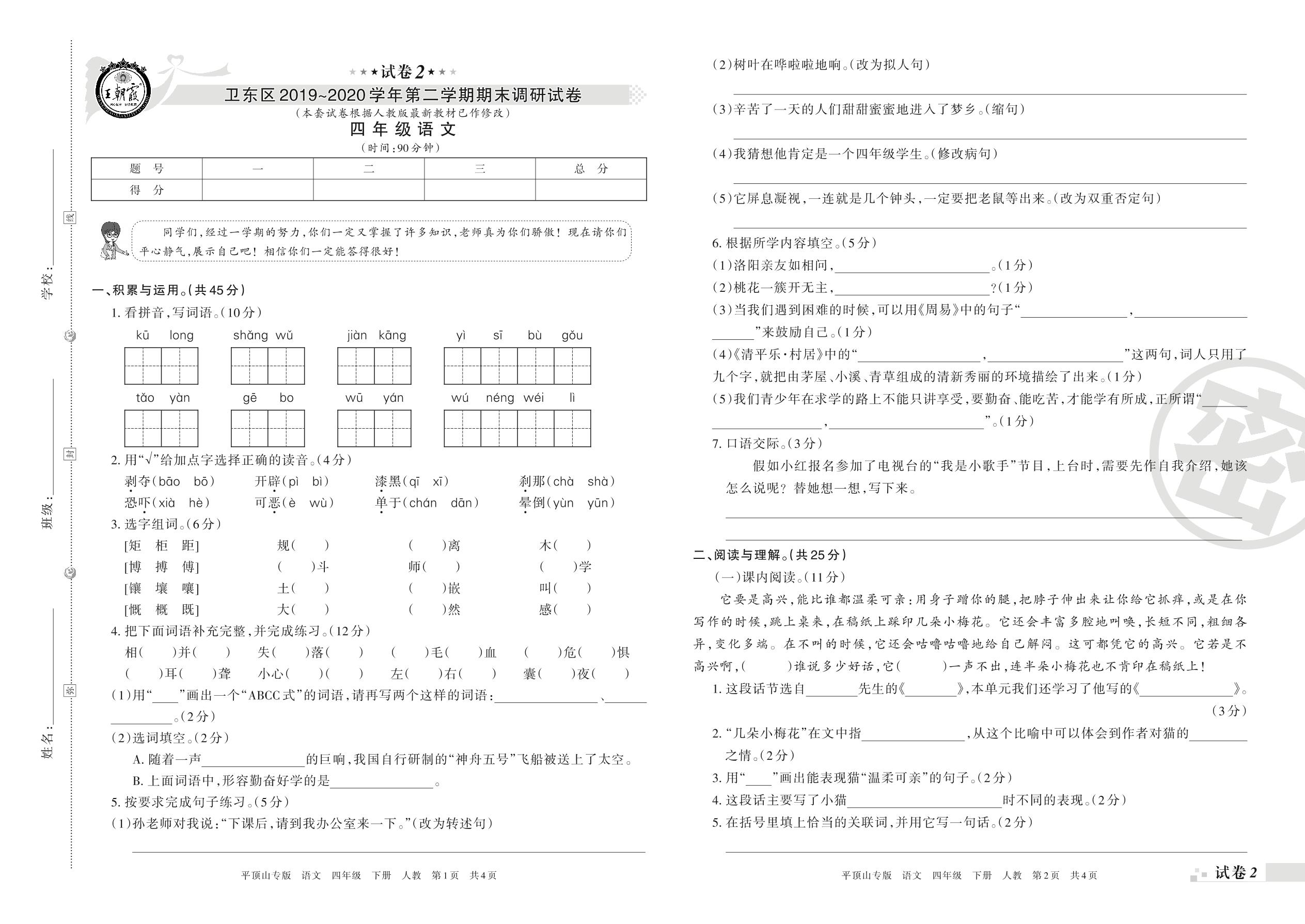 2019-2020学年第二学期平顶山市卫东区四年级语文试卷(人教版)【2】