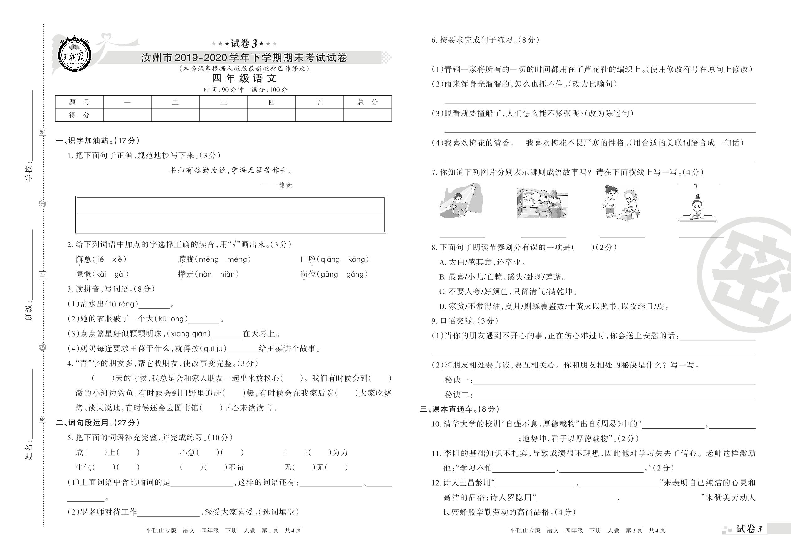 2019-2020学年第二学期汝州市四年级语文试卷(人教版)【3】