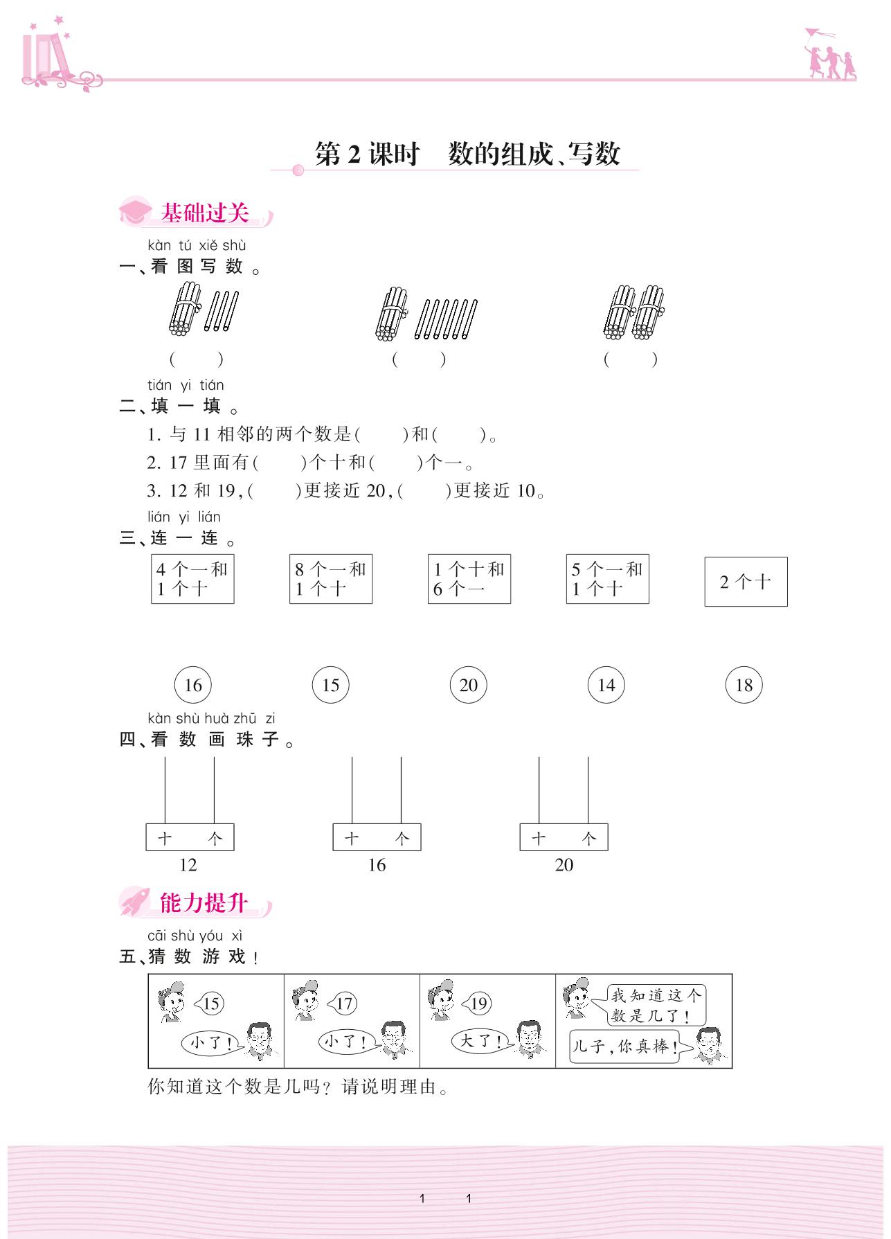 2020上册一年级数学苏教版 九 认识11~20各数——第2课时 数的组成、写数
